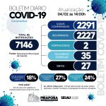 O boletim completo atualiza em 7.146 casos notificados, 2.291 casos confirmados, com 35 em isolamento e monitoramento, 2.227 recuperados, 02 hospitalizados e 27 óbitos.