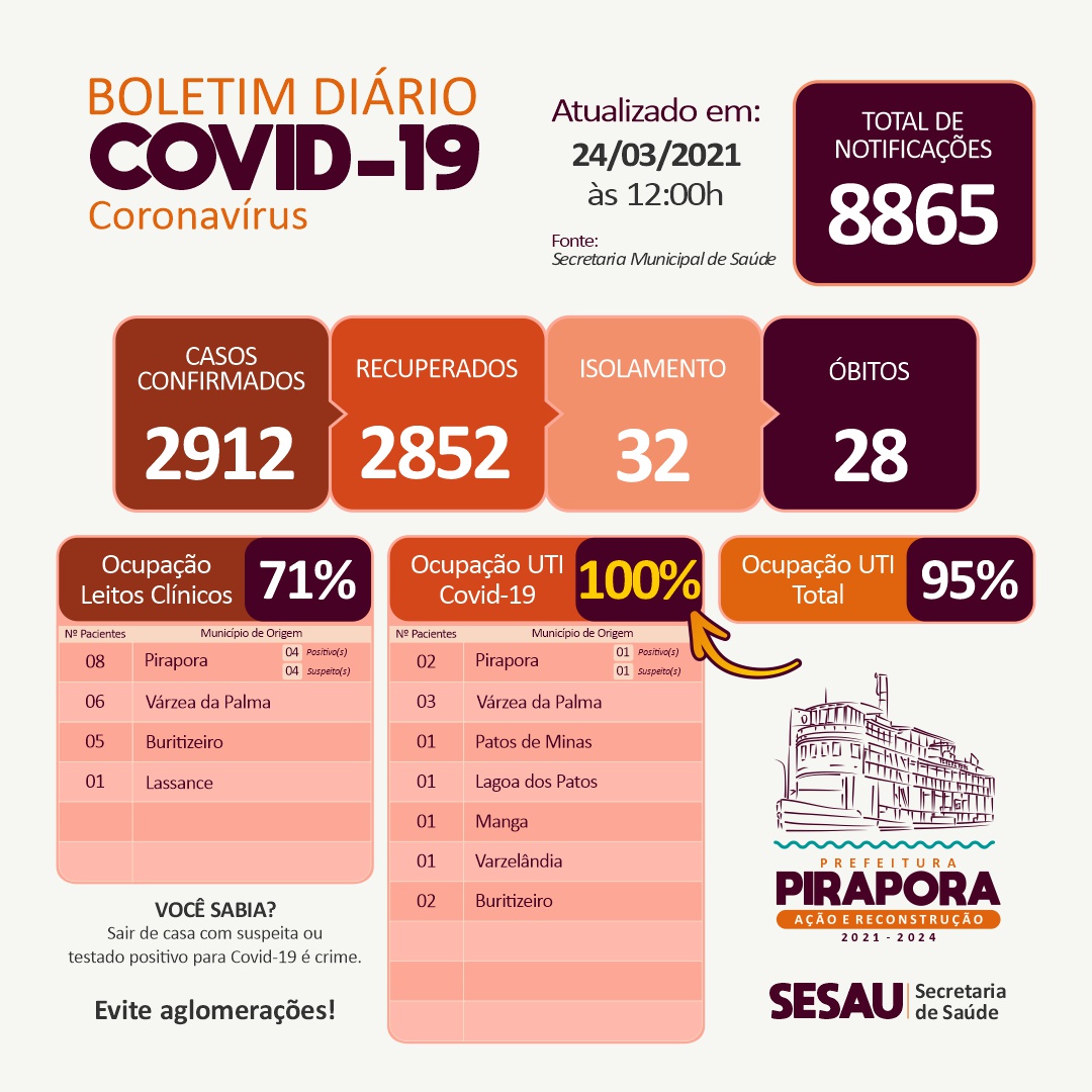 O Comitê Técnico de Enfrentamento à Covid-19 atualiza o boletim desta quarta-feira (24/03), com 18 casos positivos para a Covid-19. Sendo 06 mulheres e 12 homens, com idade entre 03 a 74 anos.