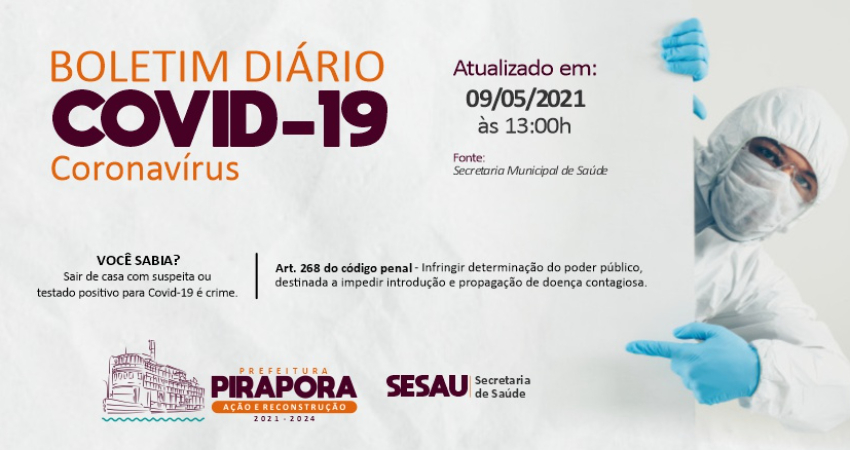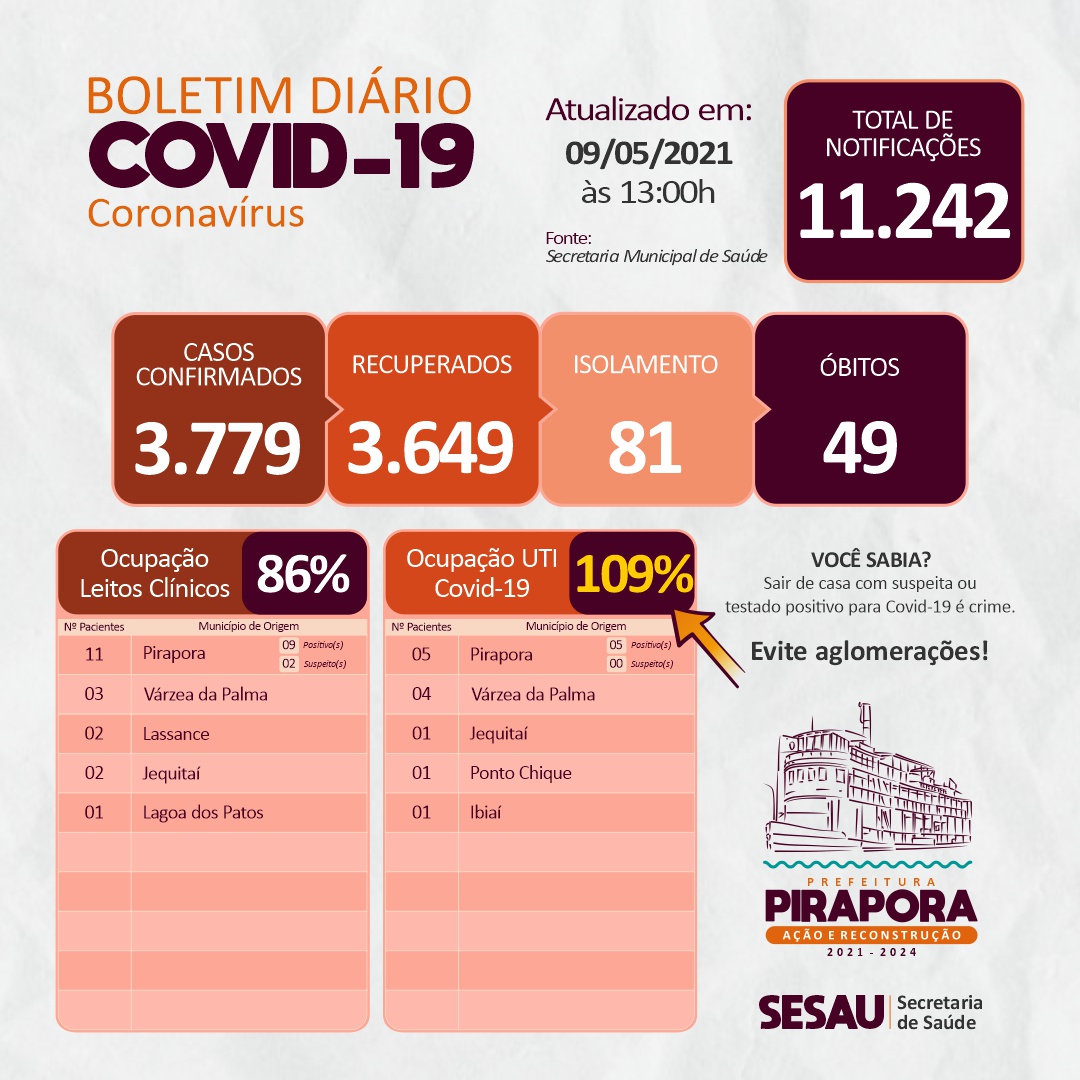 O Comitê Técnico de Enfrentamento à Covid-19 atualiza o boletim deste domingo (09/05), com 11 casos positivos para a Covid-19. São 04 mulheres e 07 homens, entre 24 a 67 anos.