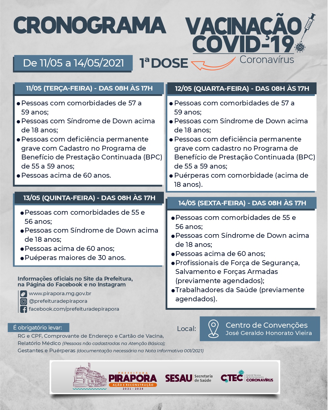 Os demais grupos de comorbidades divulgados no Cronograma de Vacinação da Prefeitura de Pirapora continua sendo realizado normalmente.