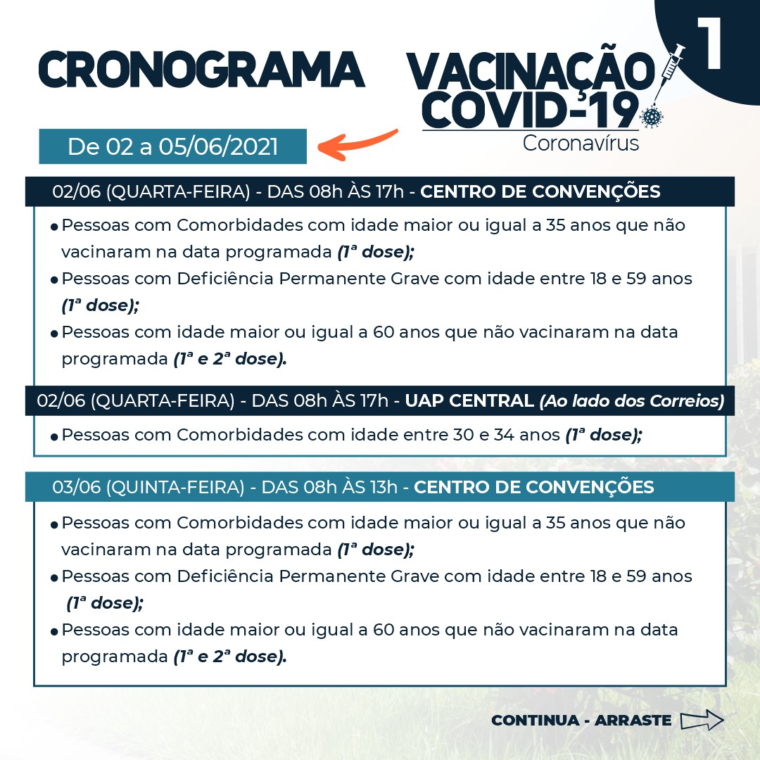 Aquelas pessoas que não vacinaram na data programada terão nova oportunidade de receber a vacina contra a covid-19. Veja o cronograma completo e a Nota Informativa para as pessoas com comorbidades.