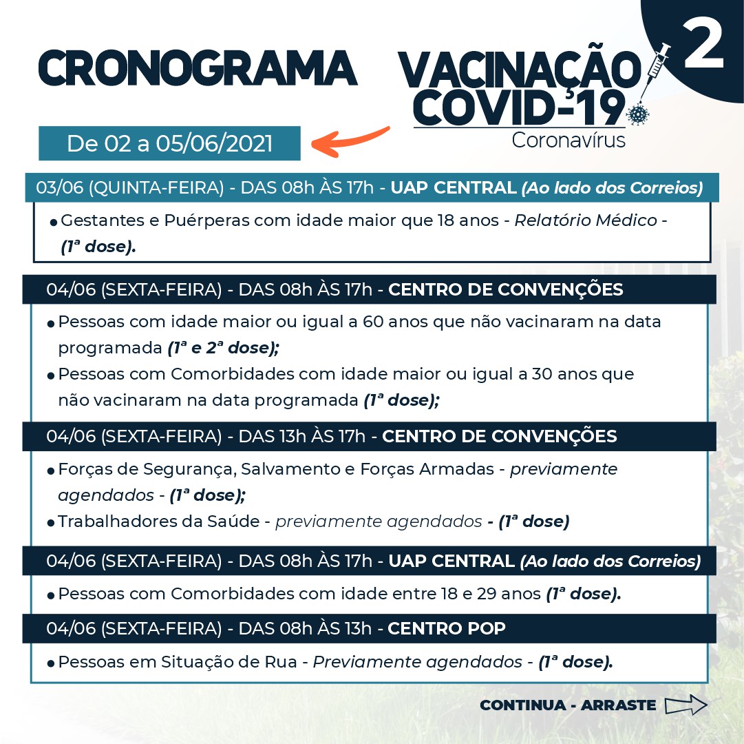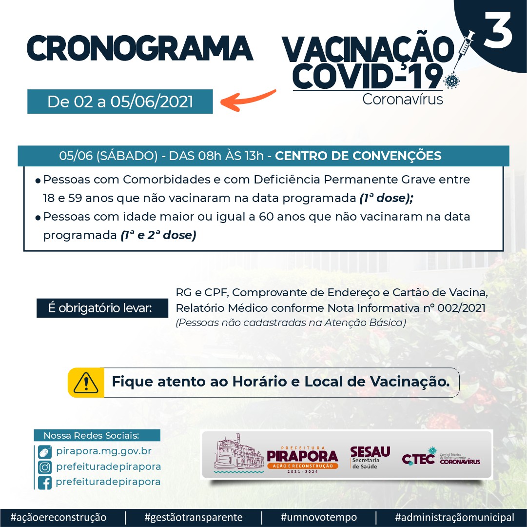 A Prefeitura de Pirapora, através da Secretaria Municipal de saúde atualiza o cronograma de vacinação contra a Covid-19. A imunização acontece no Centro de Convenções (1ª e 2ª dose) e UAP Central (1ª dose).