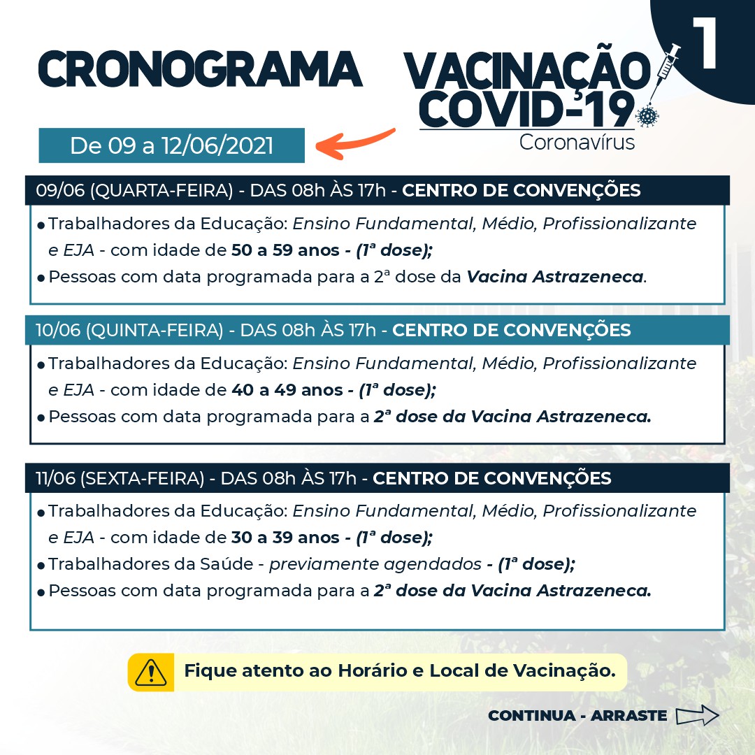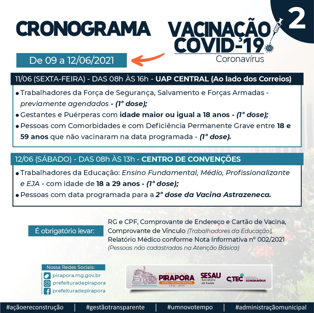 A Prefeitura de Pirapora, por meio do Comitê Técnico de Enfrentamento da Covid-19 atualiza o cronograma de vacinação contemplando todos os trabalhadores da educação. Até o próximo sábado (12/06) os profissionais do Ensino Básico, como: ensino fundamental, médio, profissionalizante (com registro no MEC) e EJA serão imunizados de acordo com o cronograma estabelecido.