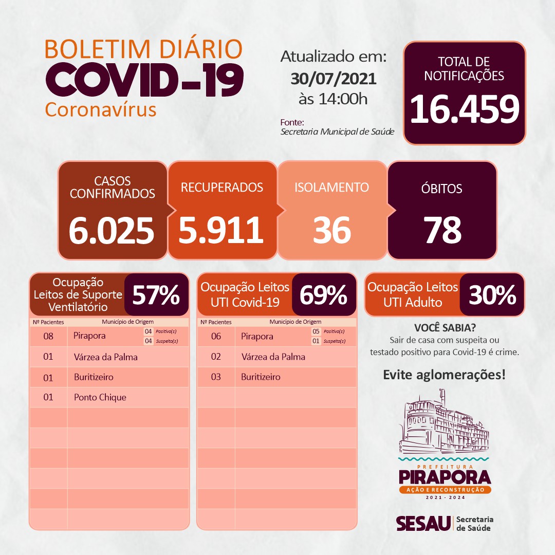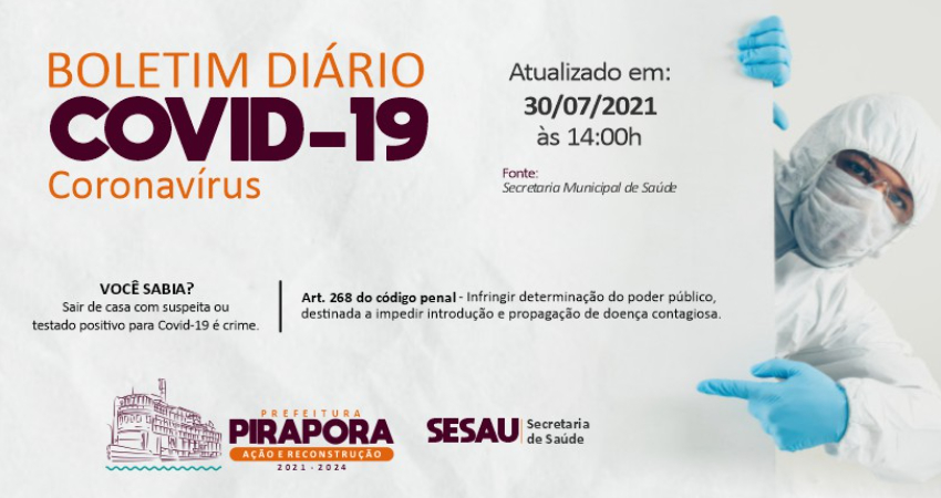 O Comitê Técnico de Enfrentamento à Covid-19 atualiza o boletim desta sexta-feira (30/07) com 03 casos confirmados para a Covid-19. Sendo 01 mulher e 02 homens, com idade entre 33 a 82 anos.