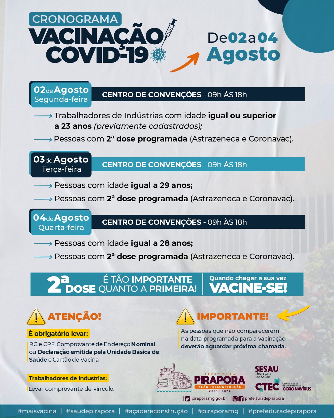 A Prefeitura de Pirapora avança na vacinação contra a covid-19 e Trabalhadores Industriais com idade igual ou superior a 23 anos (previamente cadastrados) serão imunizados e pessoas com 29 e 28 anos também serão vacinados, na terça e quarta-feira, de acordo com o cronograma de vacinação.