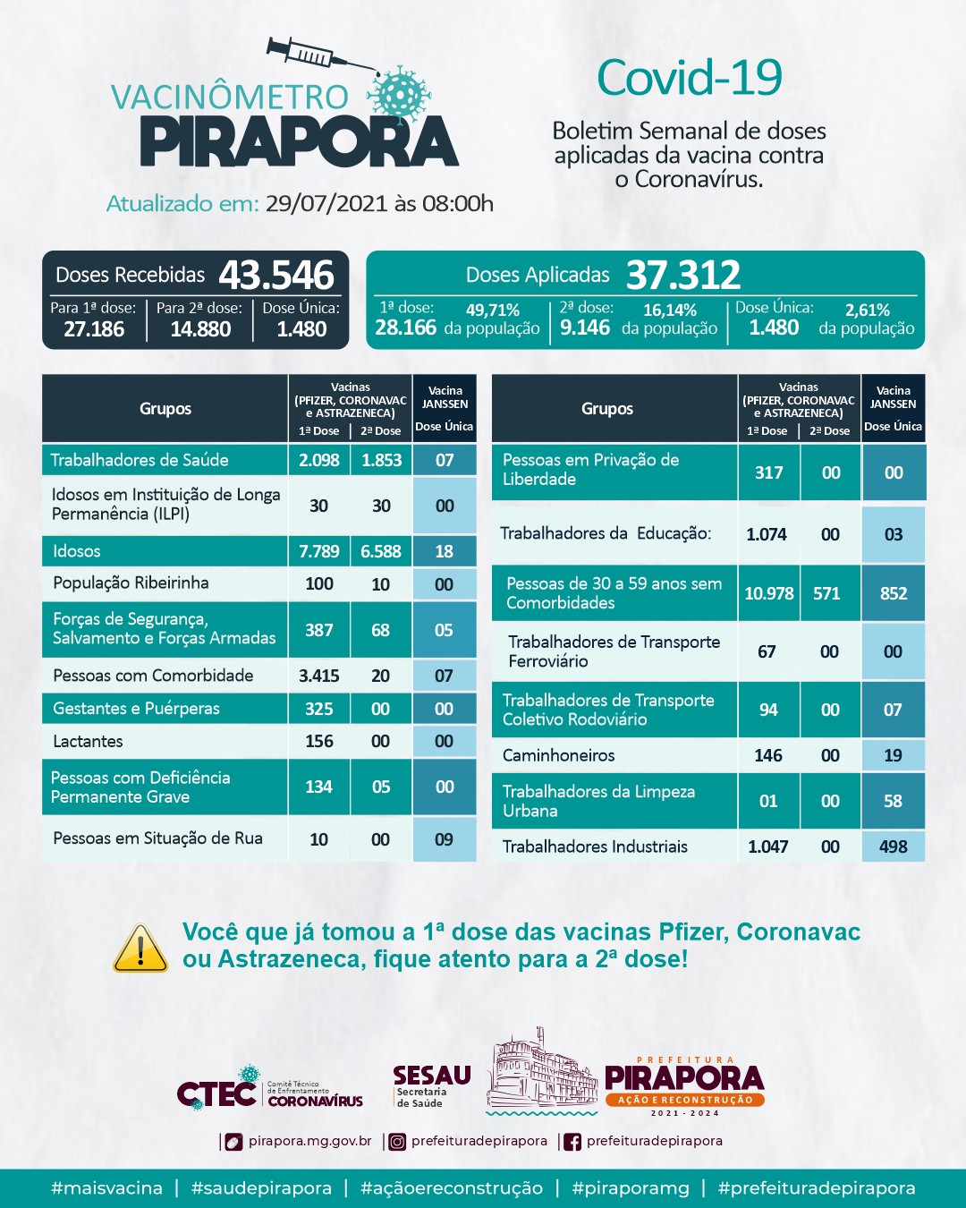 A Secretaria Municipal de Saúde, por meio do Comitê Técnico de Enfrentamento à Covid-19 atualiza o vacinômetro da semana. Foram mais de 37 mil doses aplicadas entre 1ª, 2ª (D1 e D2) e Dose Única (Janssen). Os novos grupos contemplados foram os Trabalhadores Industriais e pessoas com idade igual ou acima de 30 anos.