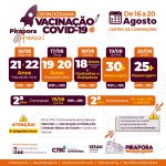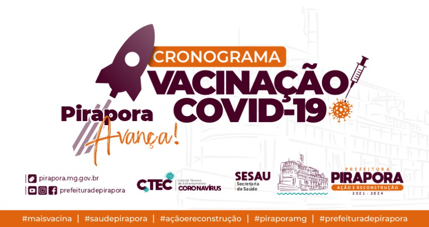 A Prefeitura de Pirapora comunica, com muito entusiasmo, a ampliação da vacina contra a covid-19. De acordo com o cronograma, a imunização começará na próxima segunda-feira (16/08) para pessoas com 21 e 22 anos; na terça para quem tiver 19 e 20 anos e na quarta-feira para as de 18 anos.