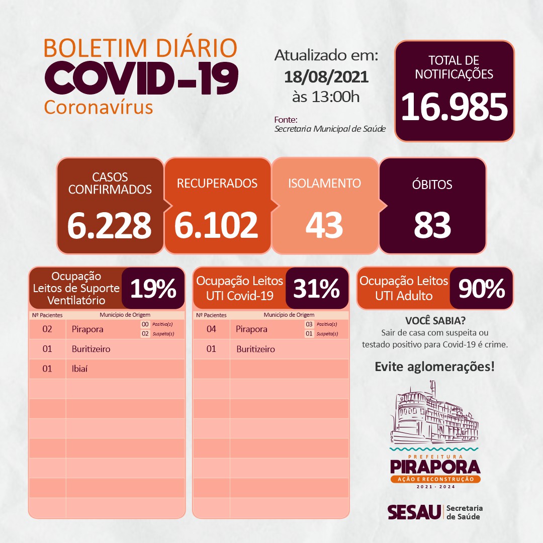 O Comitê Técnico de Enfrentamento à Covid-19 atualiza o boletim desta quarta – feira (18/08) com 06 casos confirmados para a Covid-19. Sendo 03 mulheres e 03 homens com idade entre 15 a 70 anos.