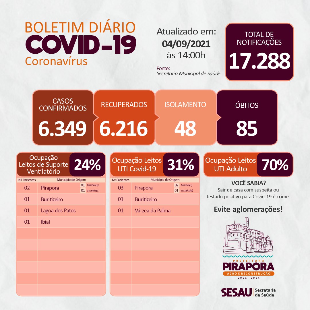 O Comitê Técnico de Enfrentamento à Covid-19 atualiza o boletim deste sábado (04/09) com 03 casos confirmados para a Covid-19. Sendo 02 mulheres e 01 homem, com idade entre 43 a 70 anos.