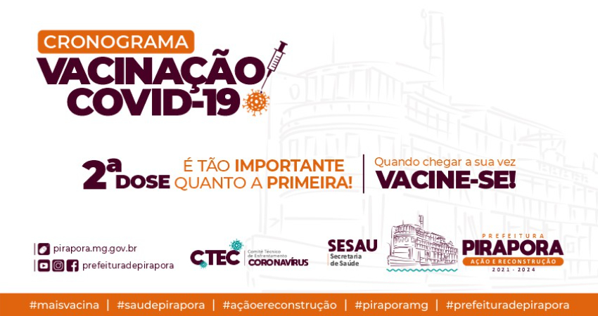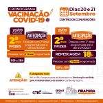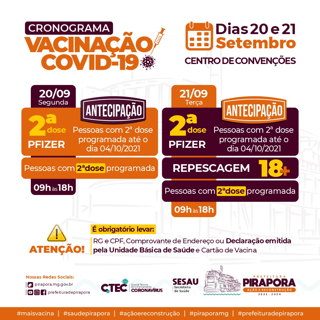 A Prefeitura de Pirapora divulga novo cronograma de vacinação contra a Covid-19. Nesta segunda e terça-feira (20 e 21/09) haverá antecipação da 2ª dose de PFIZER e repescagem para pessoas acima de 18 anos.