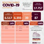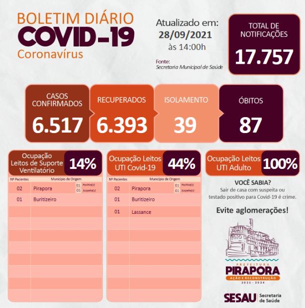 O Comitê Técnico de Enfrentamento à Covid-19 atualiza o boletim desta terça – feira (28/09) com 13 casos confirmados para a Covid-19. Sendo 04 homens e 09 mulheres com idades entre 07 e 69 anos.