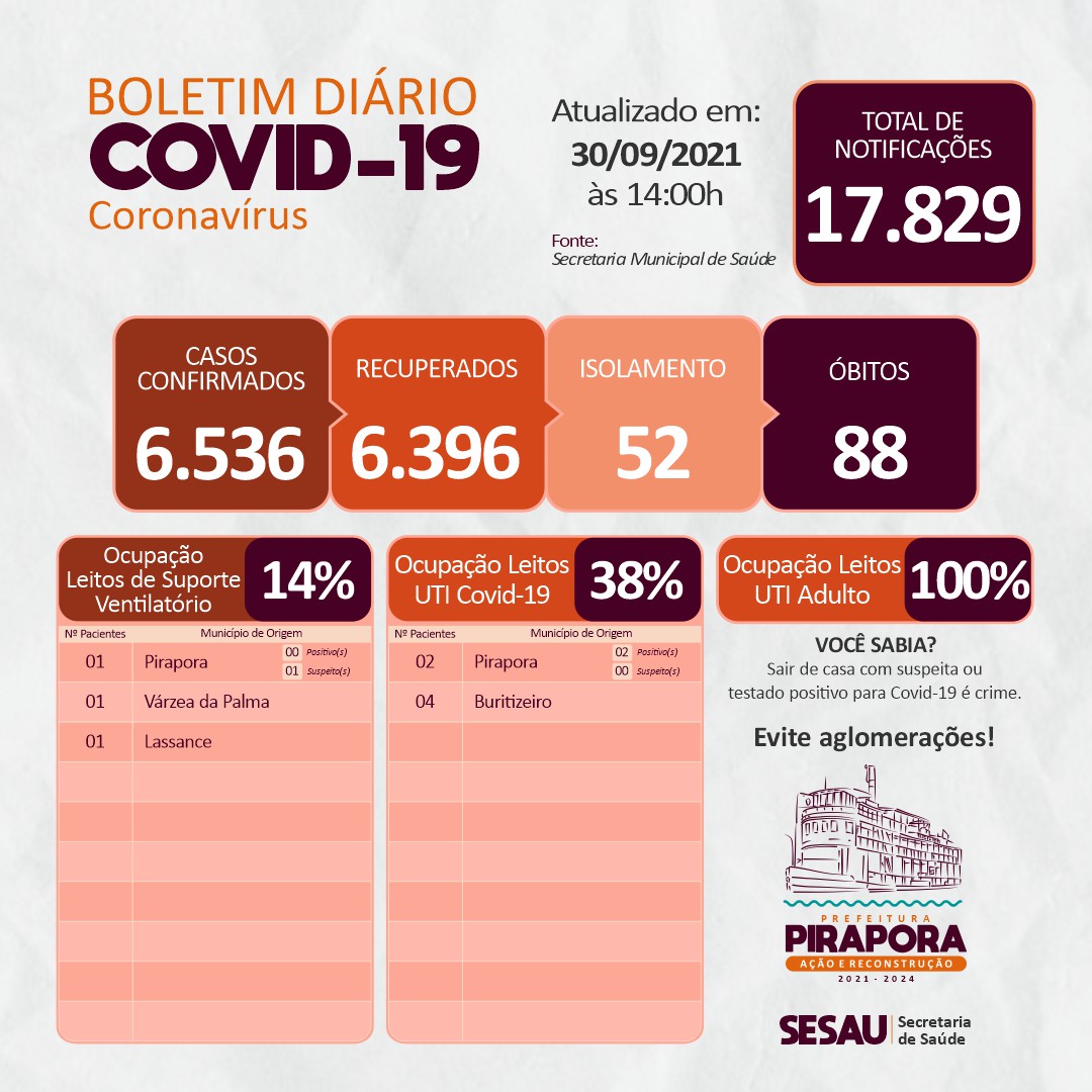O Comitê Técnico de Enfrentamento à Covid-19 atualiza o boletim desta quinta – feira (30/09) com 08 casos confirmados para a Covid-19. Sendo 04 homens e 04 mulheres com idades entre 05 e 56 anos.