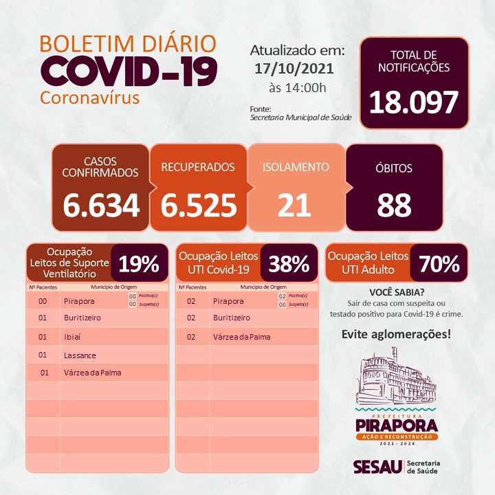 O Comitê Técnico de Enfrentamento à Covid-19 atualiza o boletim deste domingo (17/10) com 01 caso confirmado para a Covid-19. Sendo 01 homem de 76 anos.
