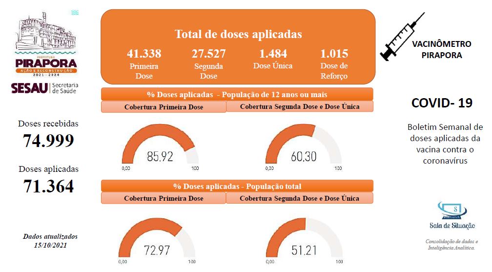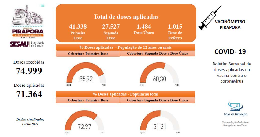 A Secretaria Municipal de Saúde, por meio do Comitê Técnico de Enfrentamento à Covid-19 atualiza o vacinômetro. Foram mais de 71 mil doses aplicadas entre 1ª, 2ª (D1 e D2) e Dose Única (Janssen). A cobertura da 1ª dose corresponde mais de 85% da população assistida, para a população de 12 anos ou mais.