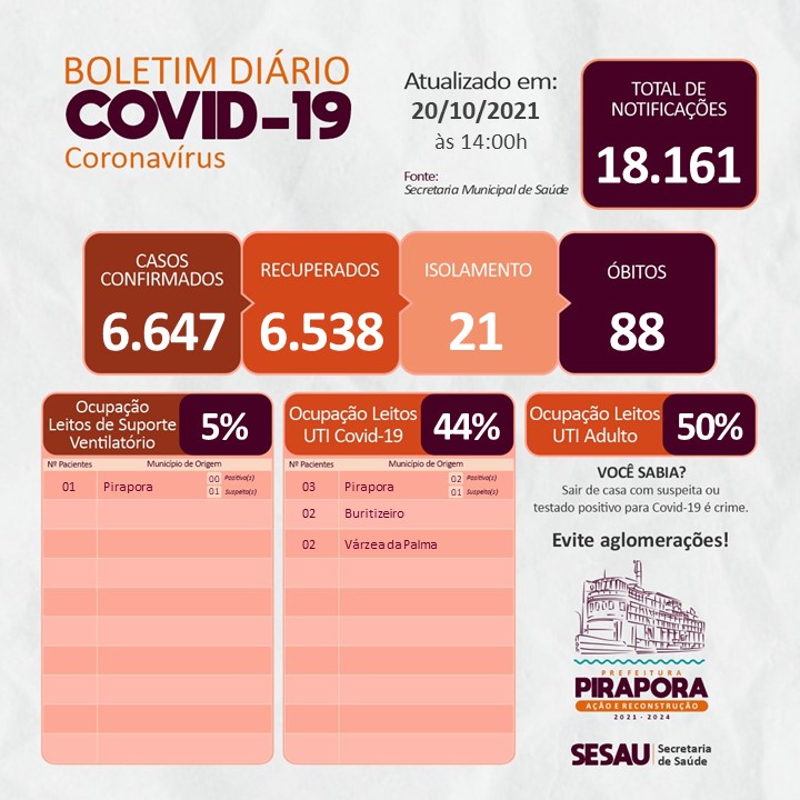 O Comitê Técnico de Enfrentamento à Covid-19 atualiza o boletim desta quarta – feira (20/10) com 04 casos confirmados para a Covid-19. Sendo 02 homens e 02 mulheres com idades entre 05 a 66 anos.