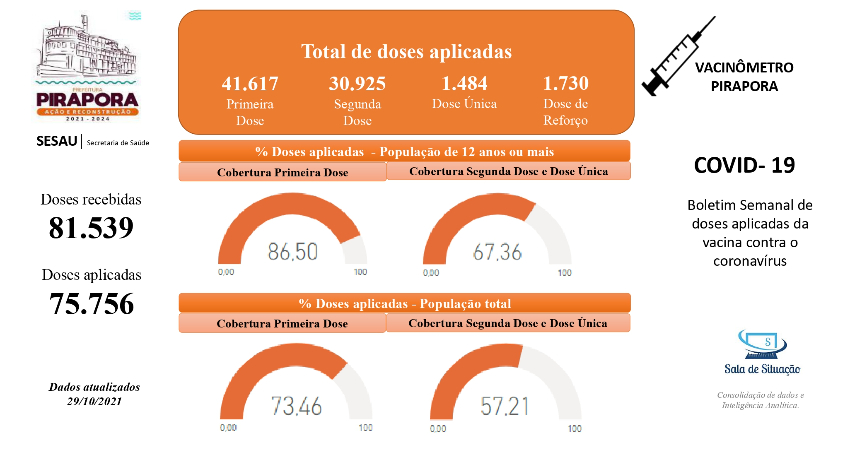 A Secretaria Municipal de Saúde divulga Vacinômetro totalizando mais de 75 mil doses aplicadas em Pirapora. O municipio já recebeu mais de 81 mil doses e segue com o cronograma de vacinação toda a semana para diversos públicos. A cobertura para a primeira dose já consta  em mais de 86%.
