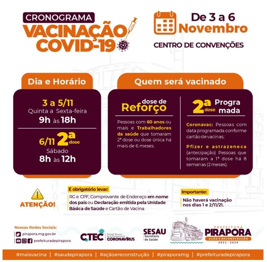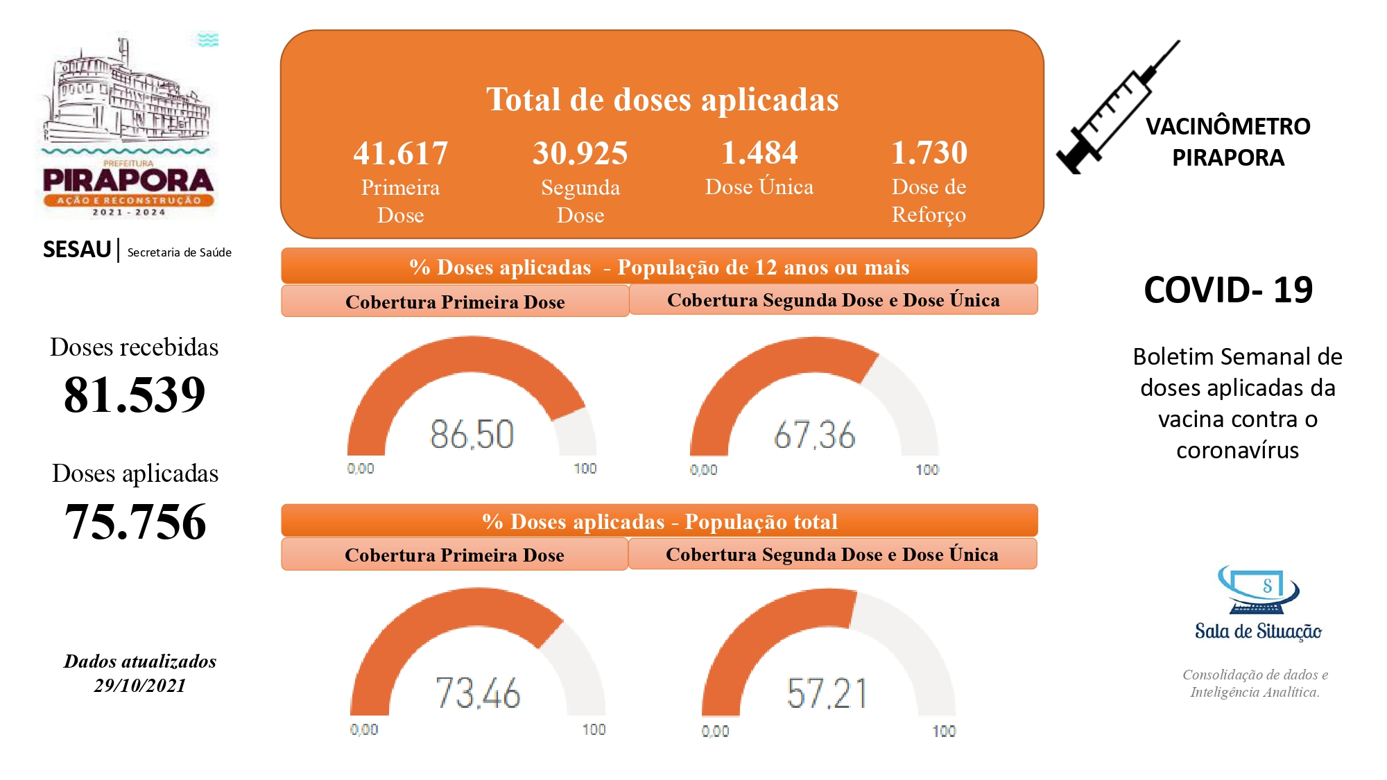 A Secretaria Municipal de Saúde divulga Vacinômetro totalizando mais de 75 mil doses aplicadas em Pirapora. O municipio já recebeu mais de 81 mil doses e segue com o cronograma de vacinação toda a semana para diversos públicos. A cobertura para a primeira dose já consta  em mais de 86%.
