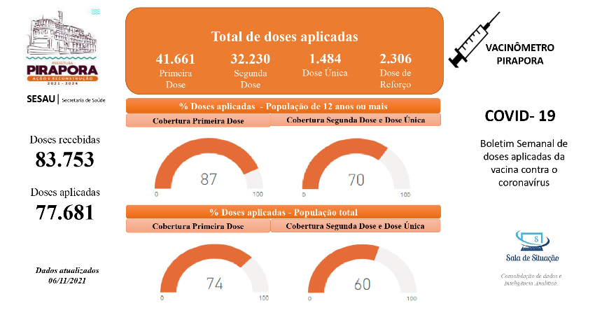 A Secretaria Municipal de Saúde divulga Vacinômetro totalizando mais de 77 mil doses aplicadas em Pirapora. O municipio já recebeu mais de 83 mil doses. A cobertura para a primeira dose já consta em mais de 87%.