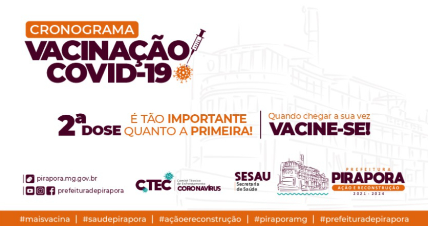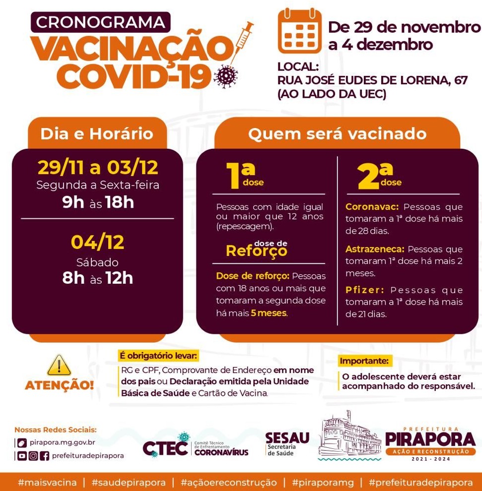 A Prefeitura de Pirapora, por meio da Secretaria de Saúde divulga o cronograma de vacinação. Entre os dias 29/11 a 04 de dezembro haverá repescagem para as pessoas com idade igual ou maior que 12 anos. A 2ª dose de Coronavac também será aplicada para aqueles que tomaram a 1ª dose há mais de 28 dias.