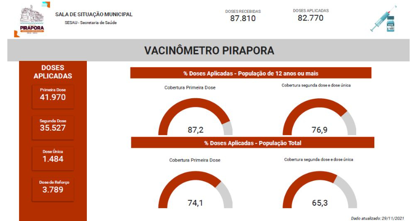 A Secretaria Municipal de Saúde divulga vacinômetro totalizando mais de 82 mil doses aplicadas em Pirapora. O municipio já recebeu aproximadamente 87 mil doses. A cobertura para a primeira dose já consta em mais de 87%.