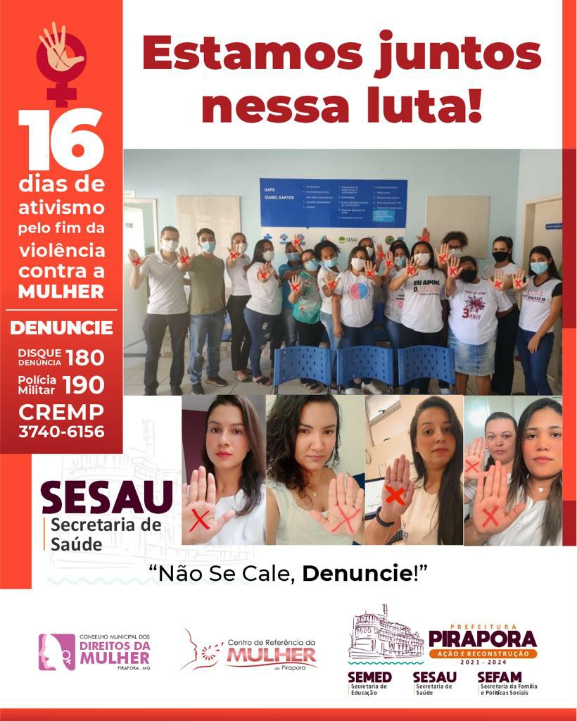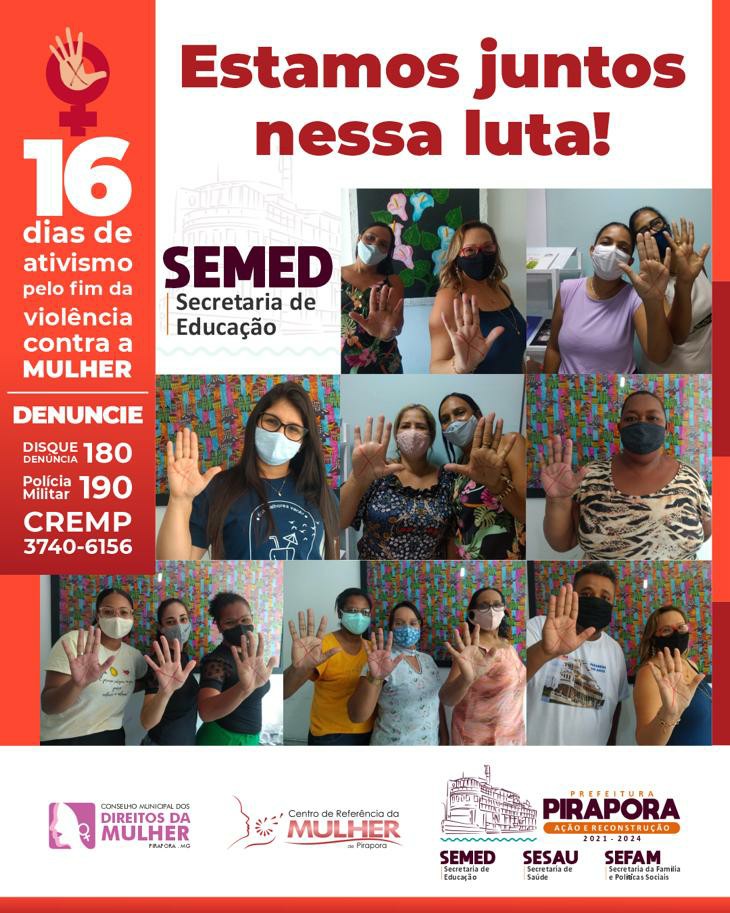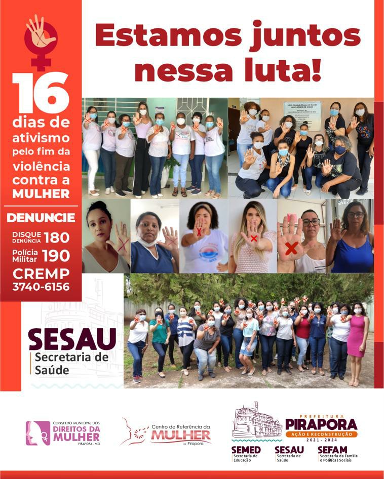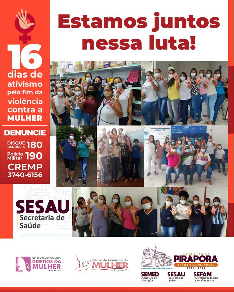 Com um sinal vermelho na mão na palma da mão, os participantes reforçame mais um símbolo da campanha pelo fim da violência contra a mulher. A ação foi idealizada pelo CREMP/SEFAM e a Saúde da mulher/SESAU e visa mobilizar, de forma prática, todos as secretarias da Prefeitura de Pirapora. Vale ressaltar que com este sinal vermelho a mulher, vítima de violência, pode pedir ajuda em farmácias, órgãos públicos e agências bancárias. As vítimas já podem contar com o apoio de cerca de 15 mil farmácias, prefeituras, órgãos do Judiciário e agências do Banco do Brasil em todo o país. Nesses locais, atendentes, ao verem o sinal, imediatamente acionam as autoridades policiais.