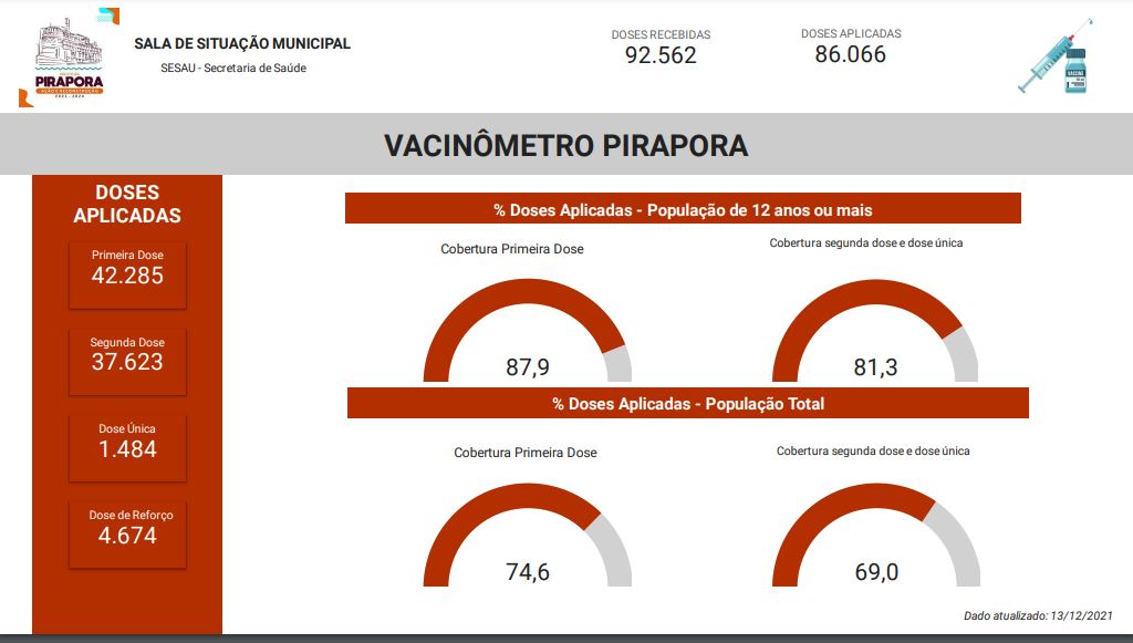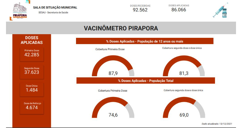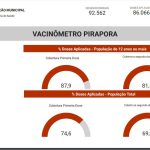 A Secretaria Municipal de Saúde divulga vacinômetro totalizando mais de 86 mil doses aplicadas em Pirapora. O municipio já recebeu aproximadamente 92 mil doses. A cobertura para a primeira dose já consta em mais de 87%.