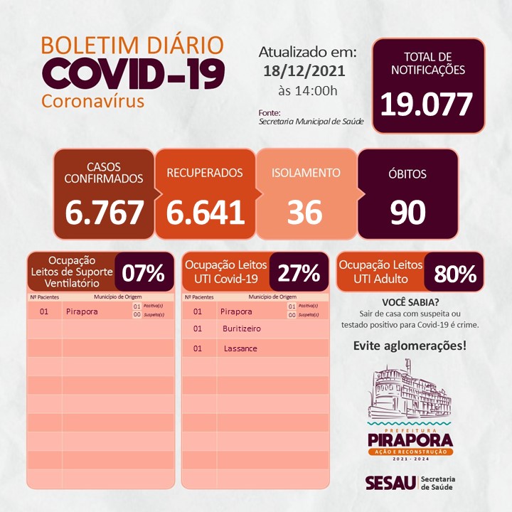 O Comitê Técnico de Enfrentamento à Covid-19 atualiza o boletim deste sábado (18/12) com 04 casos confirmados para Covid – 19. Sendo 03 homens e 01 mulher com idades entre 23 e 69 anos.