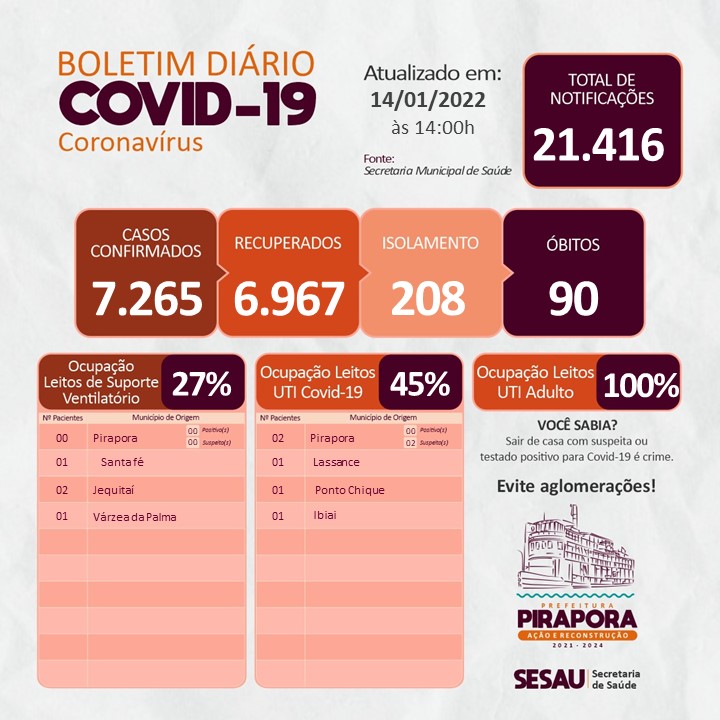 O Comitê Técnico de Enfrentamento à Covid-19 atualiza o boletim desta sexta -feira (14/01), com 58 casos confirmados para Covid – 19. Sendo 24 homens e 34 mulheres. Com idades entre 0 e 83 anos.