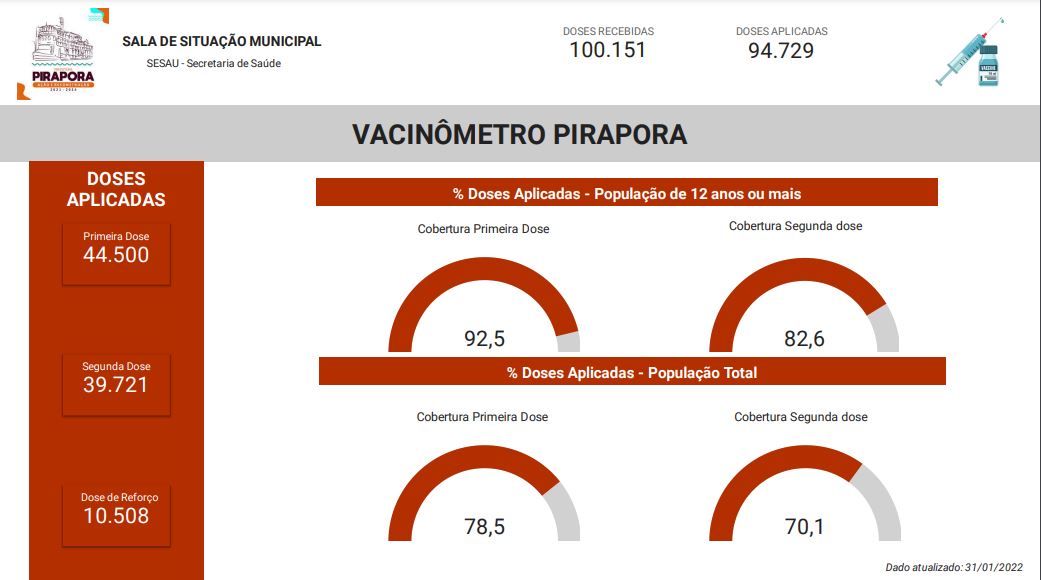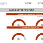 A Secretaria Municipal de Saúde divulga vacinômetro totalizando mais de 94 mil doses aplicadas em Pirapora. O municipio já recebeu aproximadamente 100 mil doses. A cobertura para a primeira dose já consta em mais de 92%.
