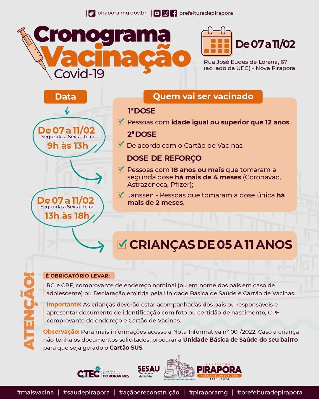 Fique ligado no cronograma da semana. Confira na galeria a imagem informativa. #vacinasim #piraporamg #acaoereconstrucao