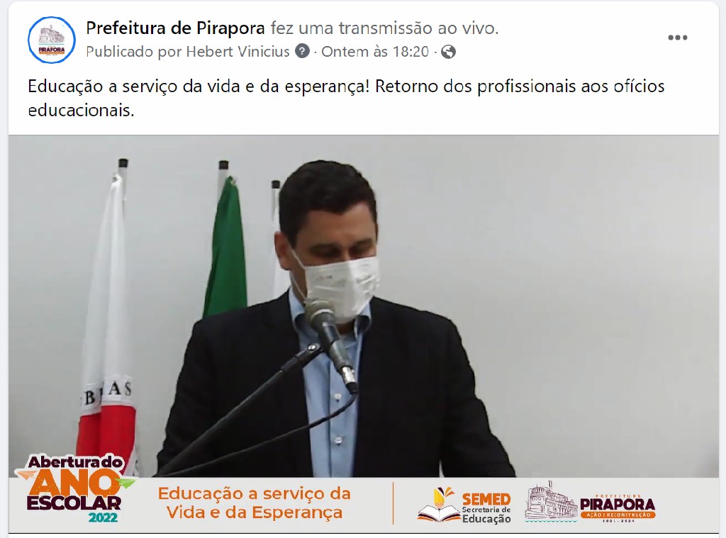 Para abrir oficialmente o Ano Escolar de 2022, a Secretaria Municipal de Educação (SEMED) promoveu na noite desta quarta-feira (09/02) uma cerimônia virtual que propiciou as boas vindas e acolhida dos profissionais da secretaria. Com o tema “Educação a serviço da Vida e da Esperança”, o evento foi transmitido ao vivo no Facebook da Prefeitura de Pirapora, em respeito aos protocolos sanitários determinados pelo Decreto Municipal Nº 007, que visa o combate da evolução da pandemia.