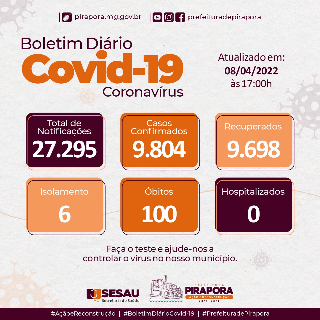 O Comitê Técnico de Enfrentamento à Covid-19 atualiza o boletim desta sexta – feira (08/04), com nenhum caso confirmado para Covid – 19.