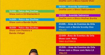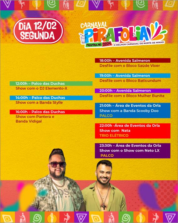 Em seu terceiro dia de programação especial, o Balneário das Duchas é o ponto de encontro dos foliões na tarde desta segunda-feira (12), com atrações até o início da noite. Na Avenida Salmeron, os desfiles dos blocos começam a partir das 18 horas, com o Bloco do Saúde e Viver, Bloco do Baticundum e o Bloco da Mulher Bonita. No palco da Praça de Eventos, os piraporenses da Banda Scooby Do serão os primeiros a se apresentar, seguido pelo show de Nata no Trio Elétrico e por Neto LX, principal atração da noite, que fecha a programação desta segunda-feira do Pirafolia.
