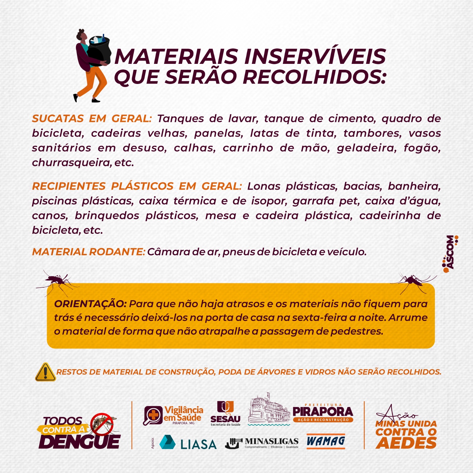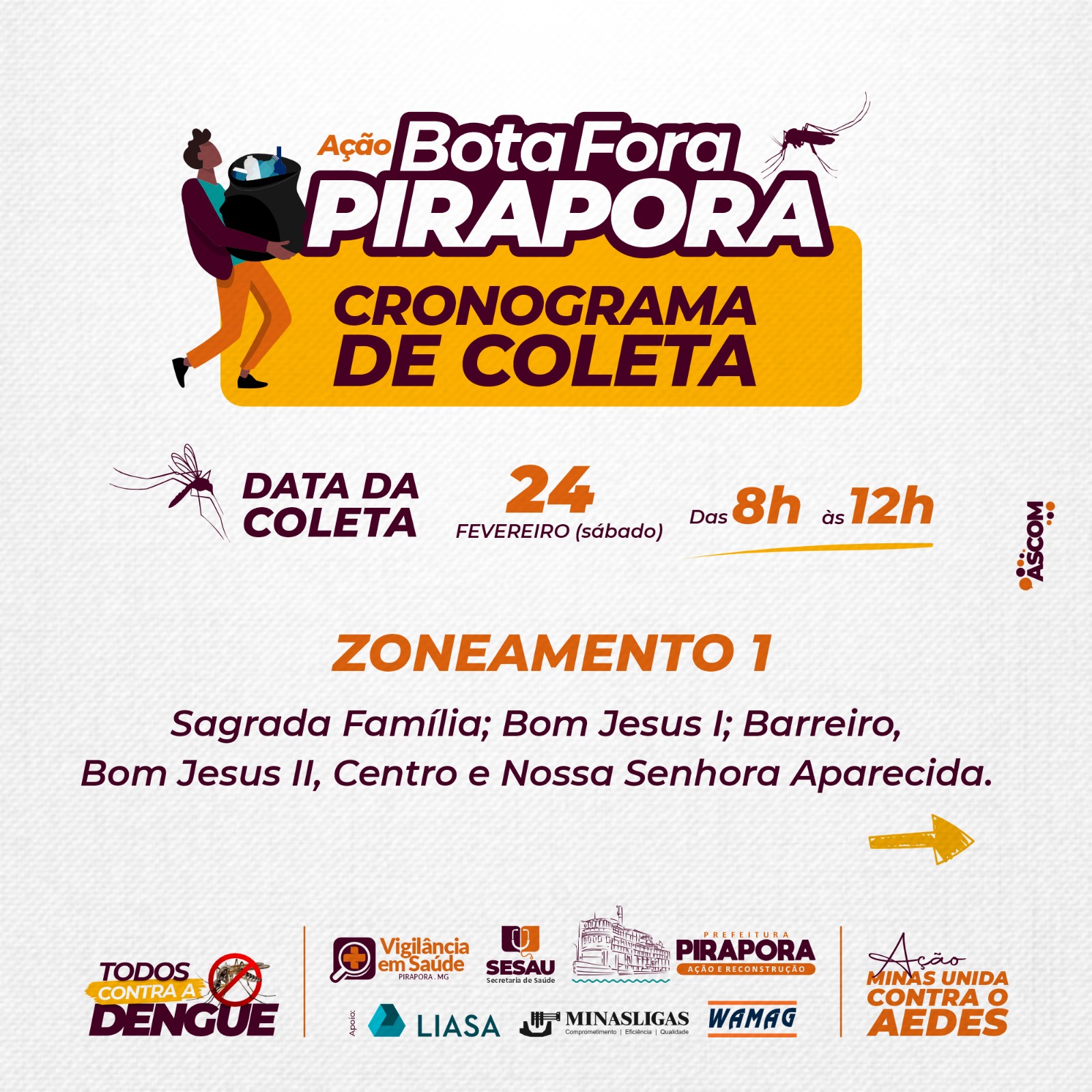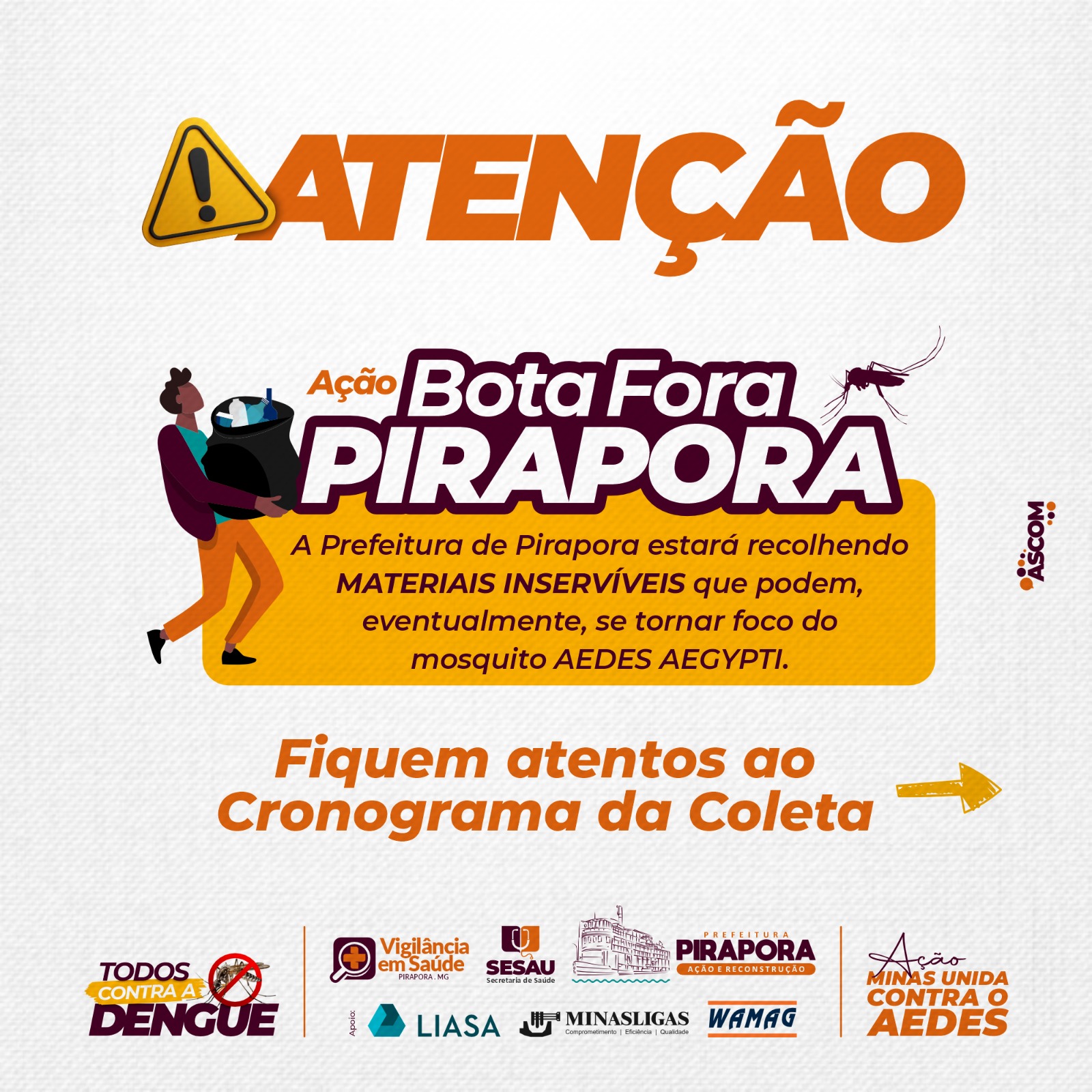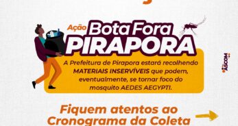 A Prefeitura de Pirapora e o Comitê Municipal das Arboviroses convoca a população, comércio e comunidade escolar para participar da Campanha de Combate ao mosquito da Dengue -Aedes Aegypti em Pirapora, com o dia ‘D’ marcado para sábado, dia 24 de fevereiro, com concentração às 7h da manhã, na Praça do Coqueirinho.