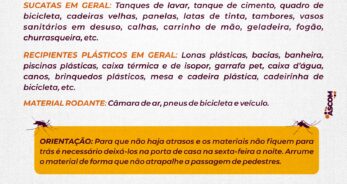 “É importante é que a população se conscientize na eliminação do foco do Aedes Aegypti. Por isso é fundamental que os moradores não deixem recipientes que possam acumular água, assim, estamos evitando criadouros e a proliferação de novos mosquitos, pois o aumento da ocorrência de mosquito está associado as altas temperaturas e a temporada de chuvas. “Essa combinação de água e calor faz com que ocorra proliferação dos mosquitos”, explicou o secretário de saúde, Rafael Lana.