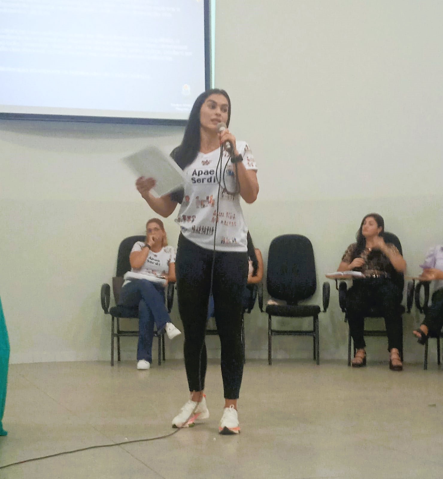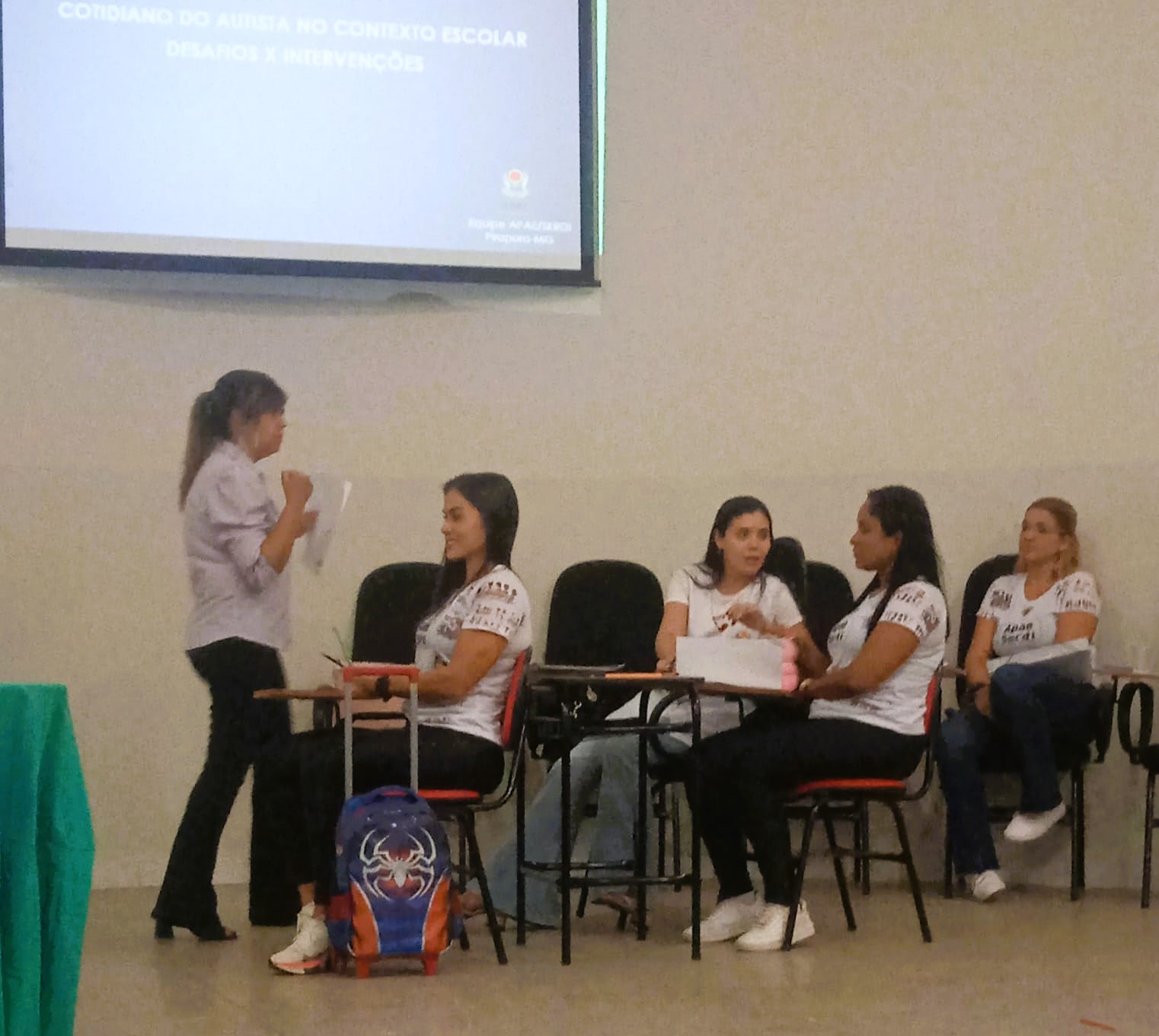 A diretora da APAE – Pirapora, Shirley Lebron explicou que o intuito do evento é levar mais informações a respeito do cuidado e acolhimento humanitário do aluno autista para a comunidade escolar e as famílias. É um momento muito rico, uma oportunidade de trocar conhecimento, experiências e situações vivenciadas no dia a dia. A federação das APAES tem como meta preparar os portadores de deficiência intelectual para a vida adulta”. Ela apresentou a equipe do SERDI e informou que, “o Transtorno do Espectro do Autismo (TEA) se caracteriza por dificuldade na comunicação social recíproca, na interação social, como por exemplo: manter o contato visual, comportamentos repetitivos, interesses restritos, além de dificuldade de identificar expressões faciais, compreender gestos comunicativos, expressar as próprias emoções e fazer amigos. Também falou sobre as principais causas, sobre os sinais e sintomas. E lembrou que a criança tem o adulto como um espelho, se o adulto falar alto, ela vai repetir o comportamento, e muitas vezes uma conversa para ela, ‘soa como um grito’. É fundamental que os pais elevem essa criança e nunca diminua a capacidade delas, pois a maioria tem uma cognição acima da média, tem capacidade de percepção avançada pois são bastante sensíveis”.