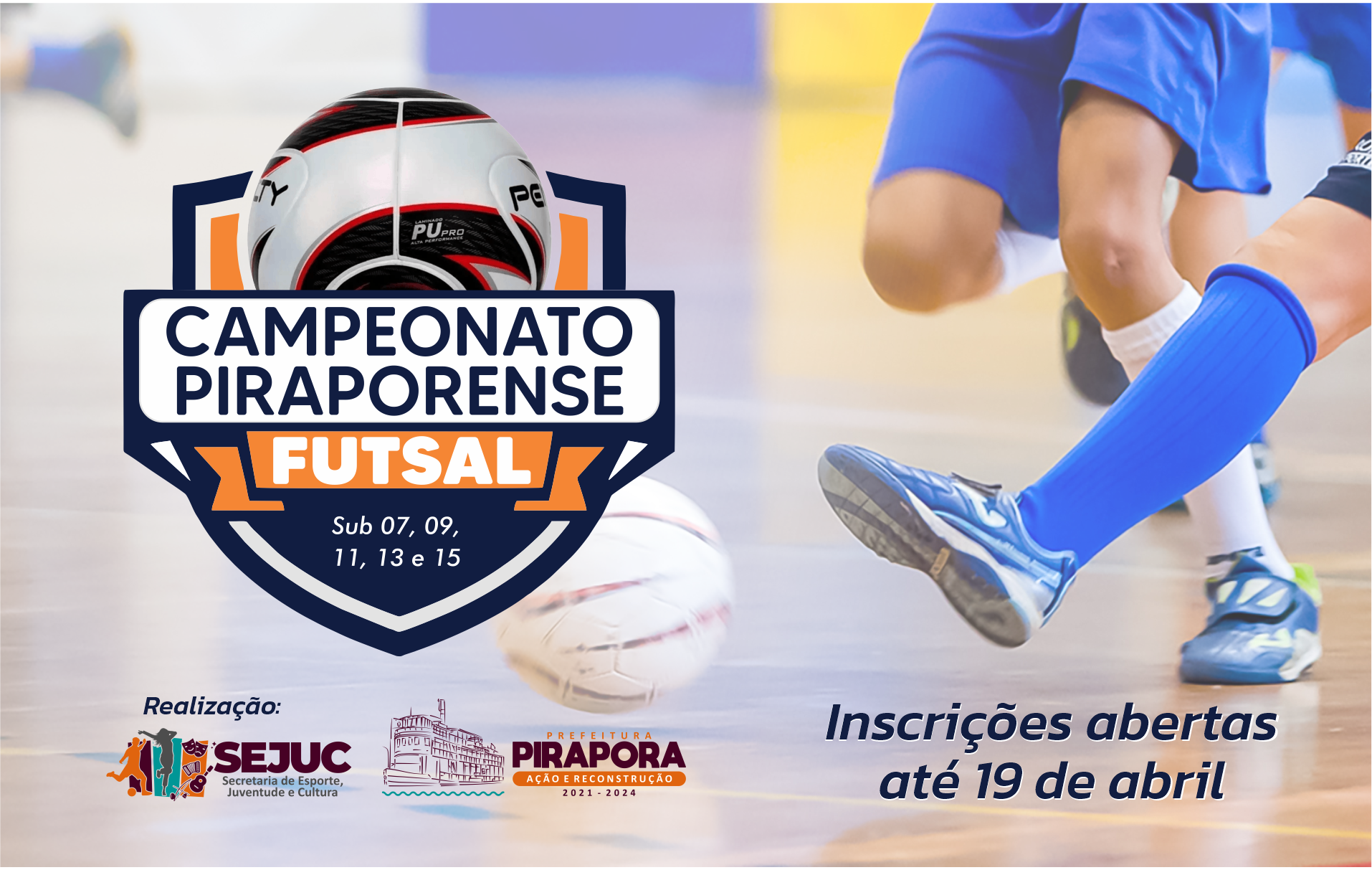 A ser realizado pela Prefeitura de Pirapora, através da Secretaria de Esporte, Juventude e Cultura (SEJUC), o Campeonato Piraporense de Futsal, voltado para as categorias Sub-07, 09, 11, 13 e 15, está com as inscrições abertas até o dia 19 de abril. A competição está programada para iniciar em 06 de maio, com todos os jogos no Ginásio Poliesportivo João Caires de Oliveira.