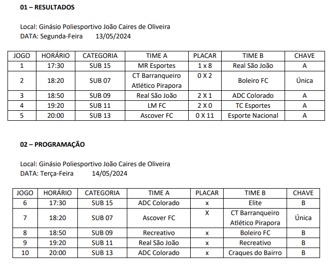 Cinco jogos deram início ao Campeonato Piraporense de Futsal (categorias de base), na noite desta segunda-feira (13/05), no Ginásio Poliesportivo João Caires de Oliveira. Realizada pela Prefeitura de Pirapora, via Secretaria de Esporte, Juventude e Cultura (SEJUC), a competição teve a sua rodada inaugural com jogos em todas as categorias que estão em disputa: Sub-07, 09, 11, 13 e 15.