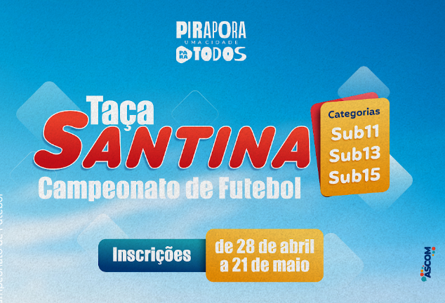 Mais uma grande novidade no Calendário Esportivo de Pirapora, promovido pela Prefeitura, através da Secretaria de Esporte, Juventude e Cultura (SEJUC), a Taça Santina está de volta e com as inscrições gratuitas abertas até 21 de maio. Voltada para as categorias Sub 11, 13 e 15, a disputa será mais uma importante vitrine para os jovens talentos de toda a região.
