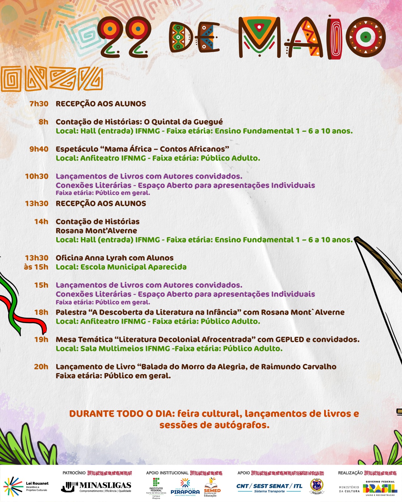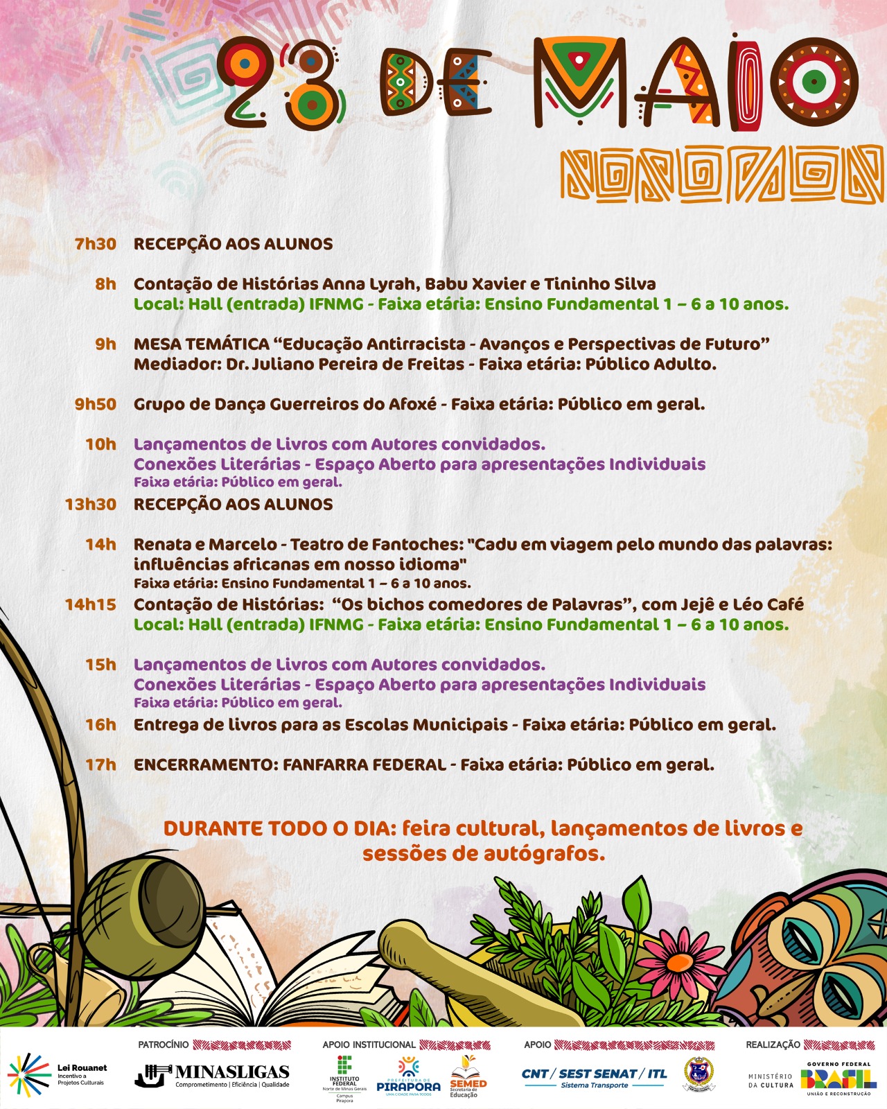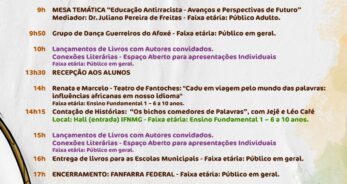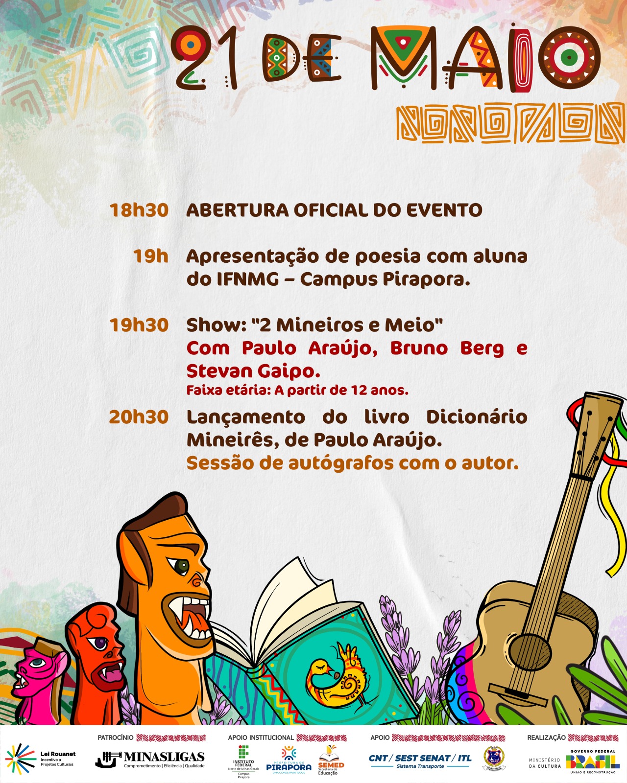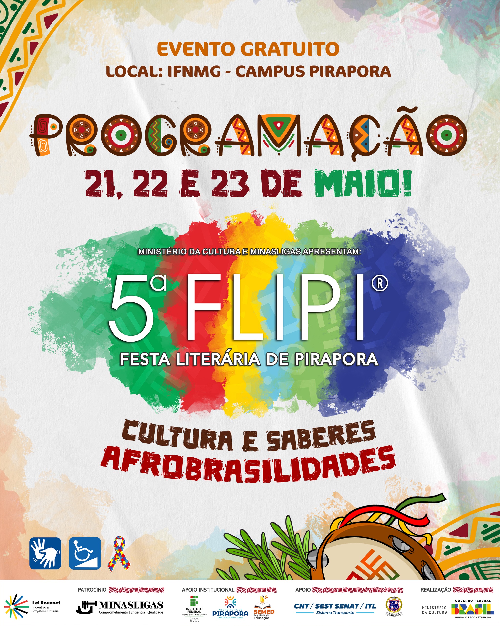 Com a temática central “Cultura e Saberes – Afrobrasilidades”, a 5ª Festa Literária de Pirapora (FLIPI) será aberta nesta quarta-feira (21/05) ofertando uma programação diversa que se estenderá até a sexta-feira (23). Com o apoio da Prefeitura de Pirapora, através da Secretaria Municipal de Educação, o evento, que celebra a literatura e o conhecimento, terá como ponto de partida muito humor com o show de stand-up inédito na cidade e o lançamento de livro, no Instituto Federal do Norte de Minas, a partir das 18:30hs.