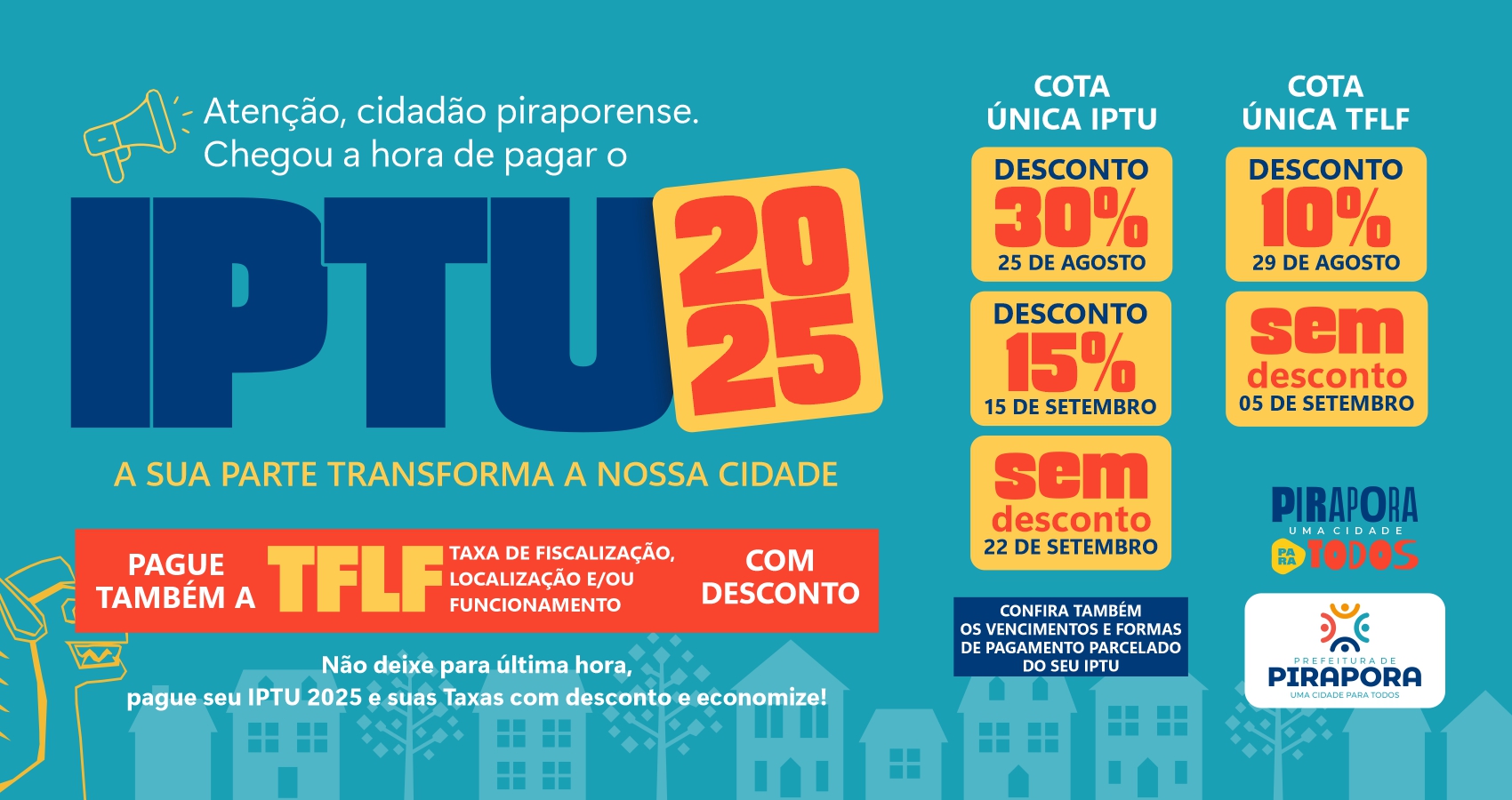 A Prefeitura de Pirapora informa que já estão disponíveis as opções e prazos para pagamento do Imposto Predial e Territorial Urbano (IPTU) e da Taxa de Fiscalização, Localização e/ou Funcionamento (TFLF), calendário 2025. A iniciativa reforça o compromisso do município em oferecer condições facilitadas para que os contribuintes mantenham seus tributos em dia, colaborando para o desenvolvimento e melhoria da cidade.
