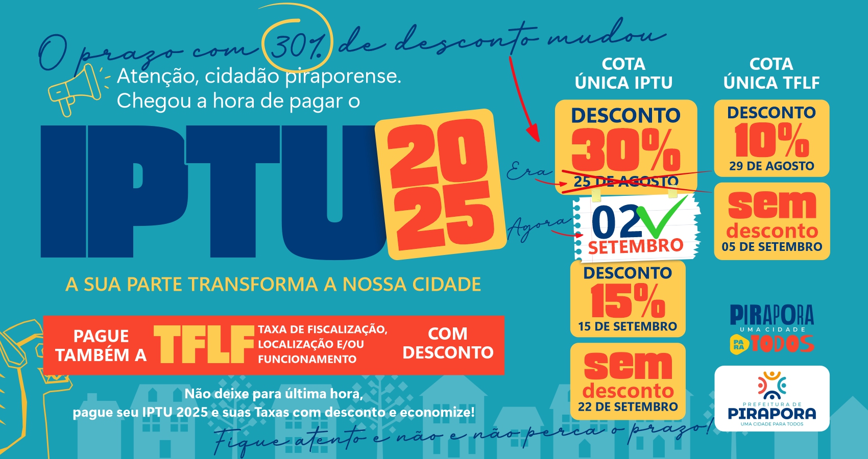 A Prefeitura de Pirapora informa que já estão disponíveis as opções e prazos para pagamento do Imposto Predial e Territorial Urbano (IPTU) e da Taxa de Fiscalização, Localização e/ou Funcionamento (TFLF), calendário 2025. A iniciativa reforça o compromisso do município em oferecer condições facilitadas para que os contribuintes mantenham seus tributos em dia, colaborando para o desenvolvimento e melhoria da cidade.