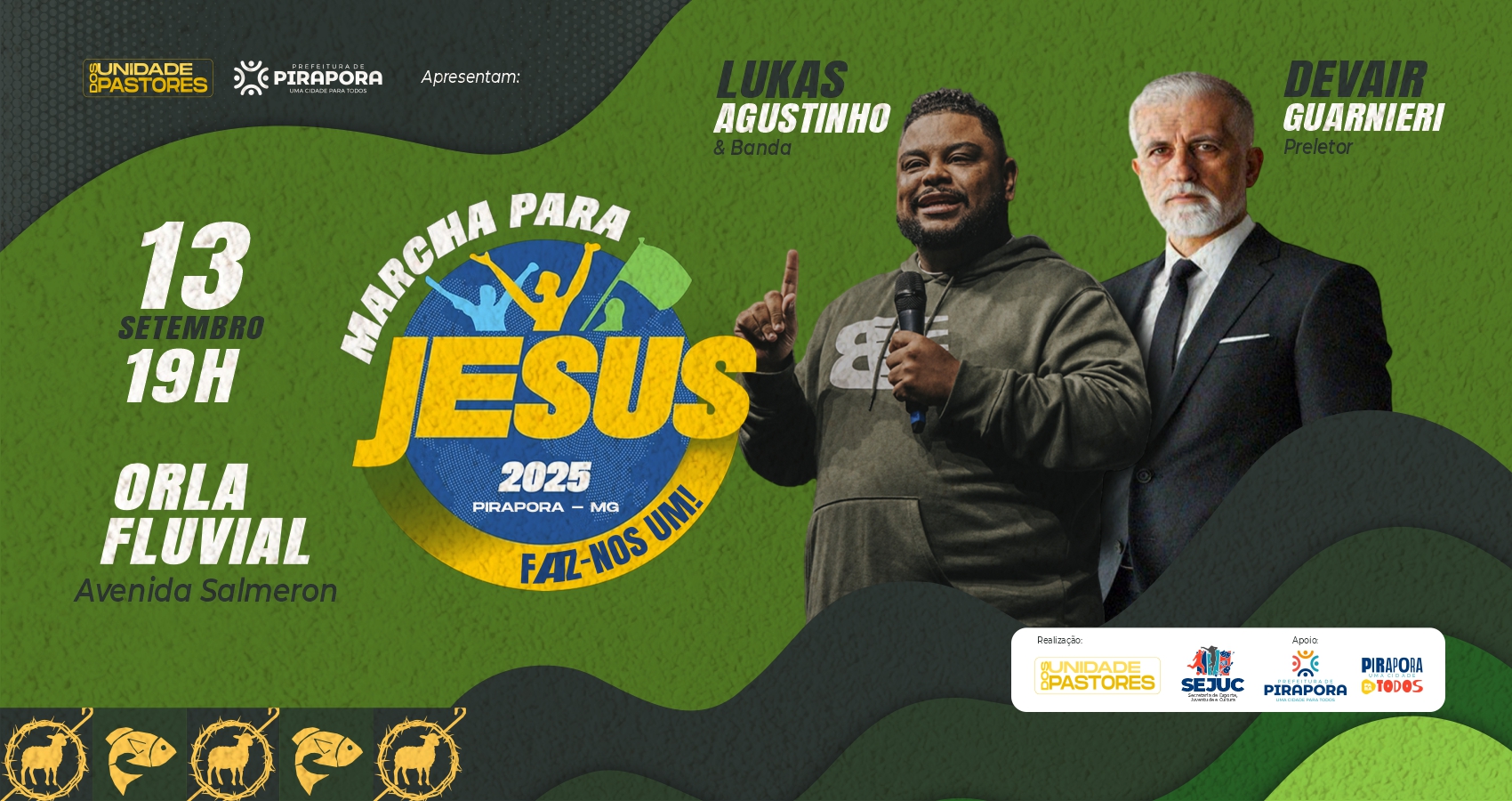 Pirapora terá muita adoração e louvor no sábado (13/09), com a Marcha para Jesus 2025, que será realizada pela Prefeitura de Pirapora, por meio da Secretaria de Esporte, Juventude e Cultura (SEJUC), em parceria com a Unidade dos Pastores. O evento será iniciado no meio da tarde e se estenderá até o final da noite com atrações da música gospel na Praça de Eventos da Orla Fluvial, com grande destaque para Lukas Agustinho, uma das principais vozes no cenário das canções cristãs, atualmente.