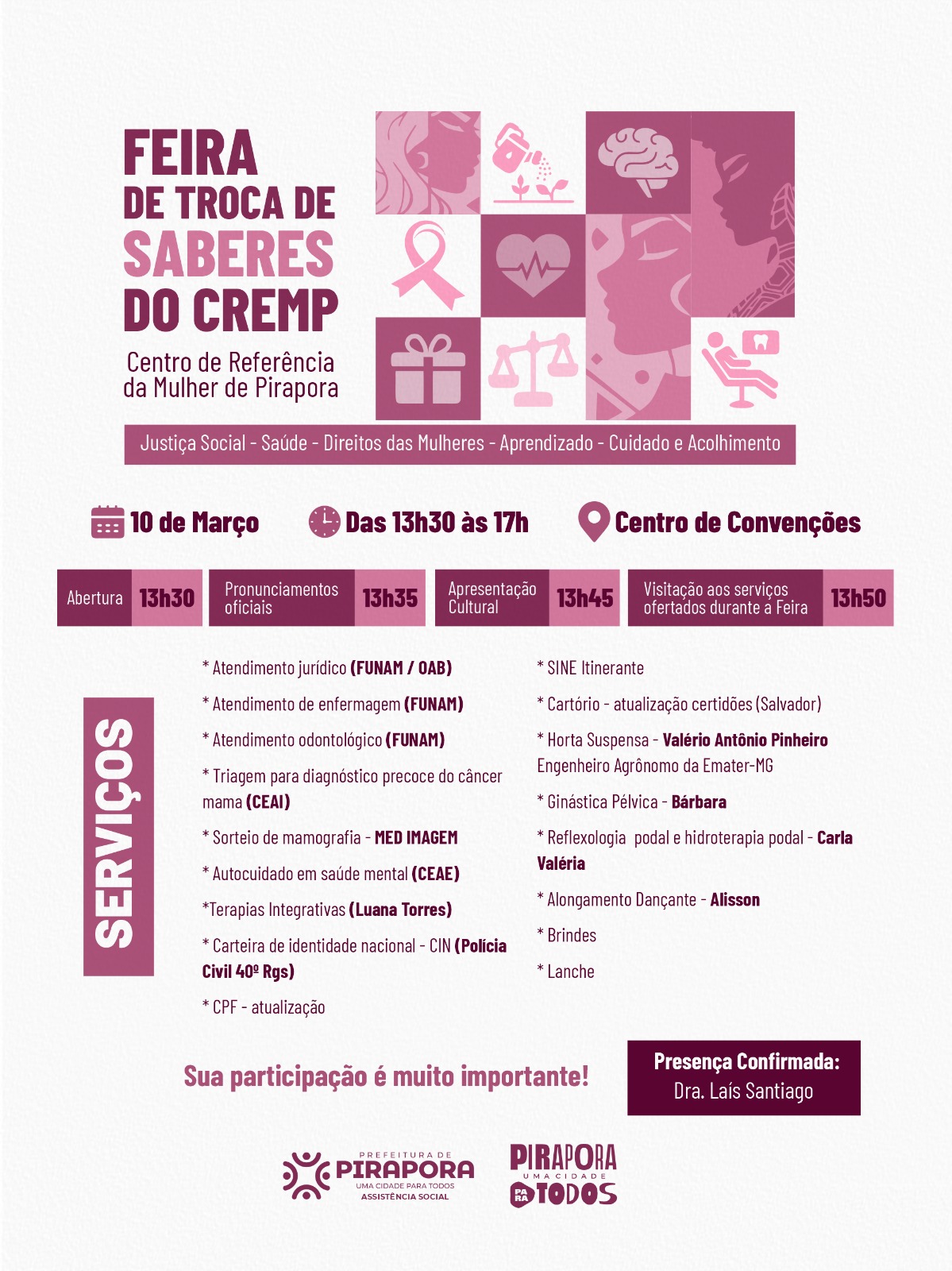 A Prefeitura Municipal de Pirapora, por meio da Secretaria Municipal de Assistência Social (SEMAS) e do Centro de Referência da Mulher, convida todas as mulheres do município para participarem da Feira de Troca de Saberes do Centro de Referência da Mulher.