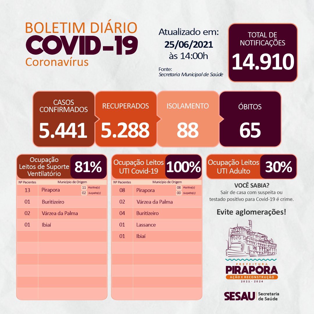 O Comitê Técnico de Enfrentamento à Covid-19 atualiza o boletim desta sexta-feira (25/06), com 36 casos positivos para a Covid-19. Sendo 19 homens e 17 mulheres, entre 12 a 70 anos.