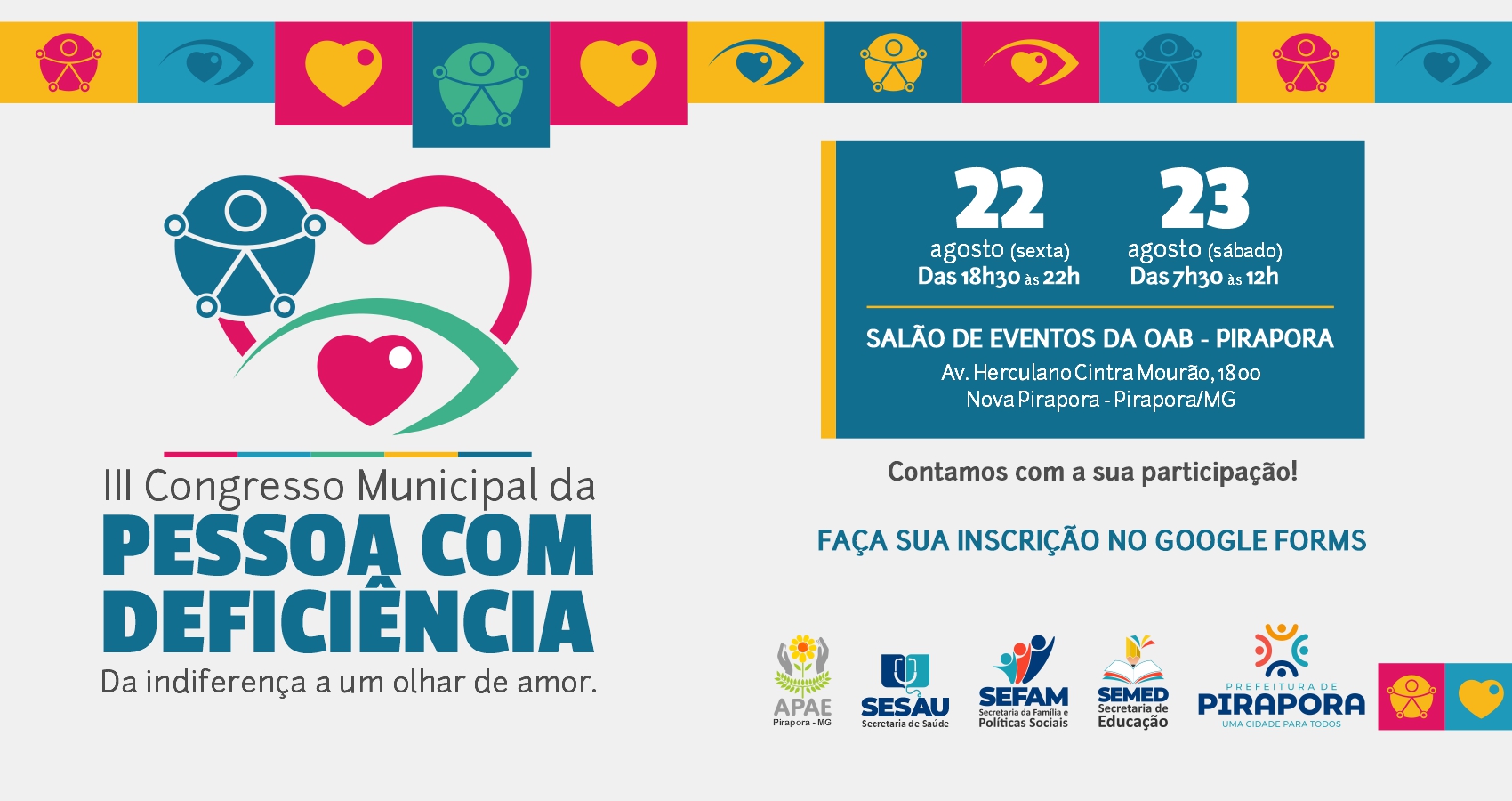 Mais uma iniciativa da Prefeitura de Pirapora, por meio da Secretaria Municipal de Educação (SEMED), o III Congresso Municipal da Pessoa com Deficiência será realizado nos dias 22 e 23 de agosto, no Salão de Eventos da OAB Pirapora. Com o tema: “Da indiferença a um olhar de amor”, o evento está com inscrições abertas gratuitamente e terá uma programação específica para estimular a amplitude das políticas públicas e inclusivas em toda a região.