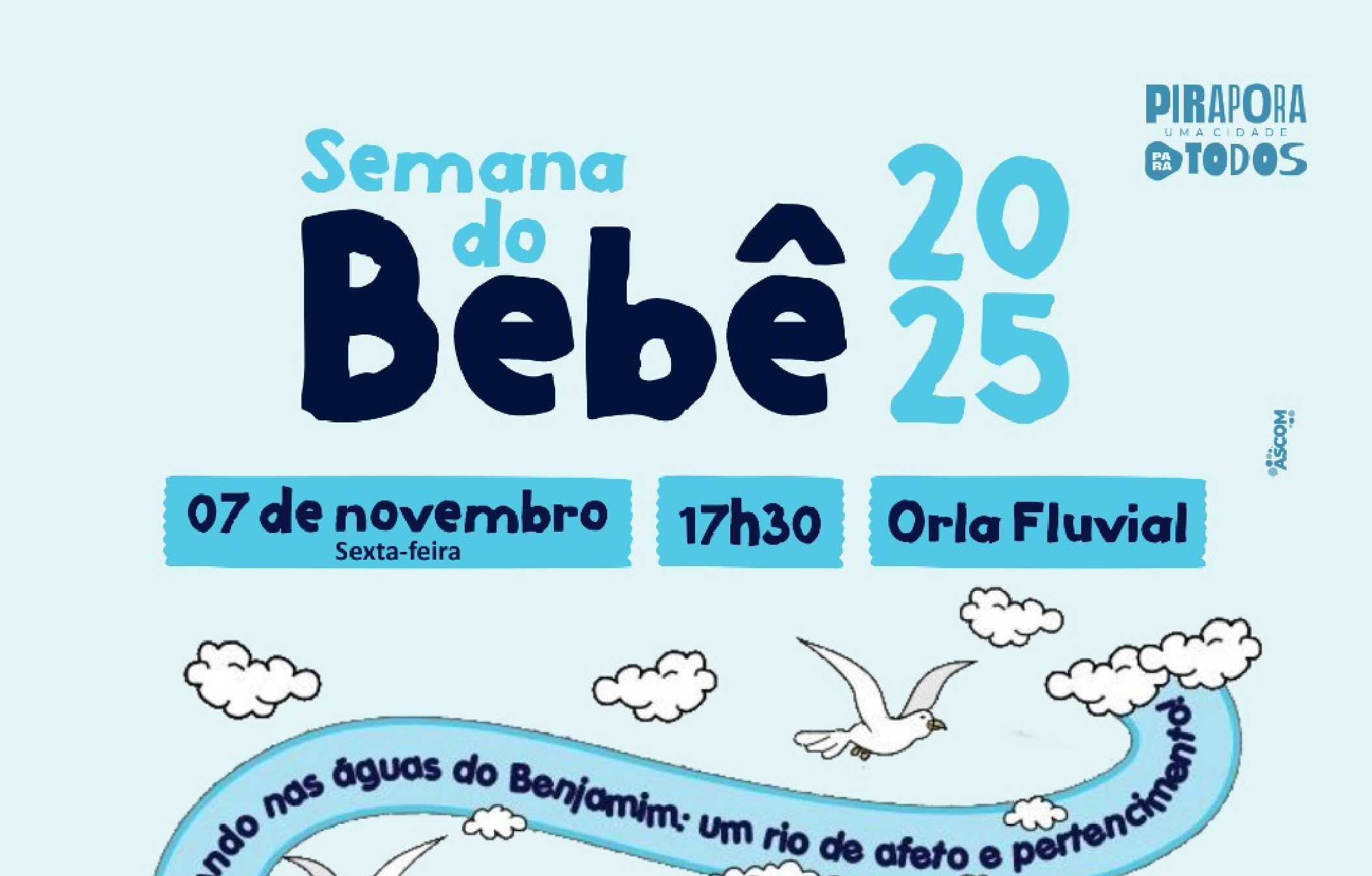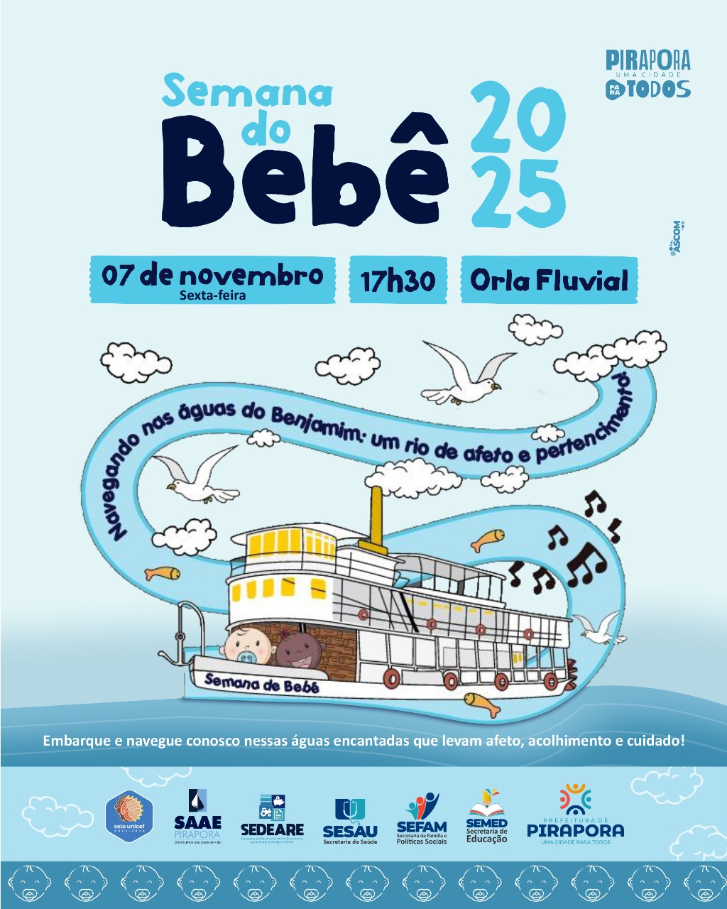 Nesta sexta-feira (07/11), a partir das 17:30 hs na Praça de Eventos da Orla Fluvial, será finalizada a programação da Semana do Bebê 2025. Promovida pela Prefeitura de Pirapora, por meio da Secretaria Municipal de Educação (SEMED), Secretaria da Família e Políticas Sociais (SEFAM) e Secretaria de Saúde (SESAU), a iniciativa proporcionará para o público, em sua culminância, um espaço especial para a visitação de stands temáticos e atrações culturais, com entrada franca.
